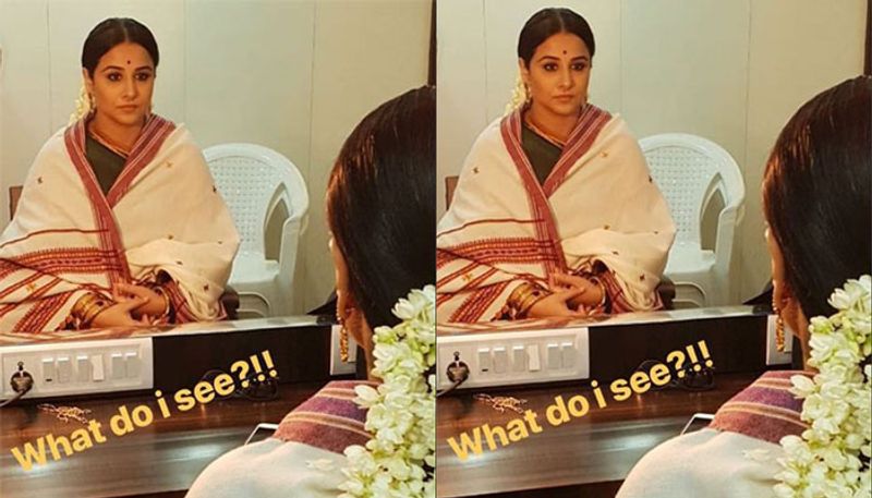 తాజాగా ఎన్టీఆర్ భార్య బసవతారకం పాత్ర పోషిస్తోన్న బాలీవుడ్ బ్యూటీ విద్యాబాలన్ లుక్ బయటకి వచ్చింది. బసవతారకం మాదిరి తయారై అద్దం ముందు కూర్చొని తనను తానే చూసుకుంటున్న ఫోటోని సోషల్ మీడియాలో షేర్ చేసింది విద్యాబాలన్. ఫోటోపై 'నేనేం చూస్తున్నాను'' అని రాసుంది.