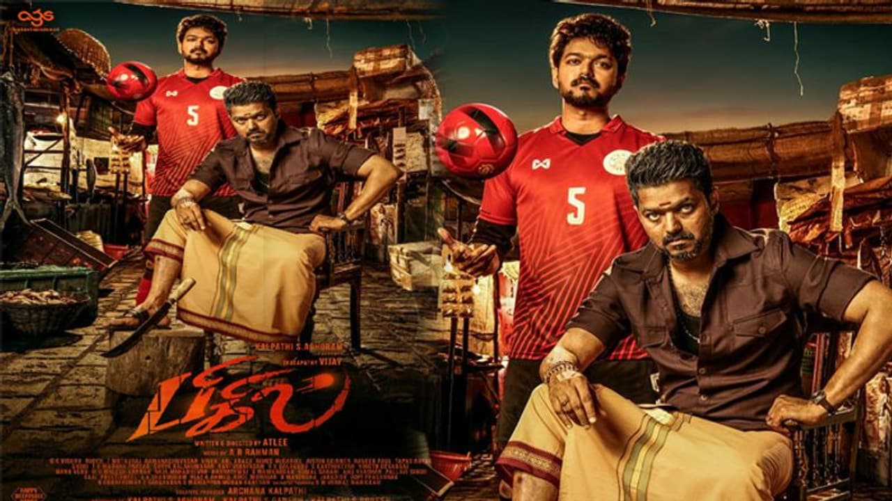 రెండు పాత్రల్లో విజయ్ అదుర్స్ అనిపించే విధంగా ఉన్నాడు. ఈ చిత్రం ఫుట్ బాల్ నేపథ్యంలో తెరకెక్కుతుందని మాత్రం ఇప్పటివరకు వార్తలు వచ్చాయి. కానీ విజయ్ డ్యూయెల్ రోల్ లో నటిస్తుండడం మాత్రం ఊహించని ట్విస్టే. ఫస్ట్ లుక్ రిలీజ్ కాగానే సోషల్ మీడియాలో విజయ్ అభిమానుల సందడి పెరిగింది. ఏఆర్ రెహమాన్ ఈ చిత్రానికి సంగీతం అందిస్తున్నాడు.