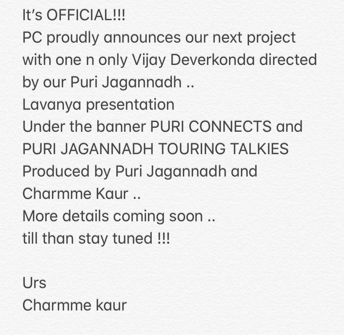 అయితే ఫైనల్ గా ఈ కాంబినేషన్ పై అఫీషియల్ ఎనౌన్స్మెంట్ వచ్చేసింది. లైన్ ప్రొడ్యూసర్ ఛార్మి సోషల్ మీడియా ద్వారా ఈ విషయాన్నీ తెలిపింది. త్వరలోనే పూరి డైరెక్షన్ లో విజయ్ సినిమా స్టార్ట్ కాబోతున్నట్లు చెబుతూ.. పూరి భార్య లావణ్య సమర్పణలో పూరి జగన్నాథ్ టూరింగ్ టాకీస్ పై సినిమాను పూరి - ఛార్మి సంయుక్తంగా నిర్మించనున్నట్లు పేర్కొన్నారు.