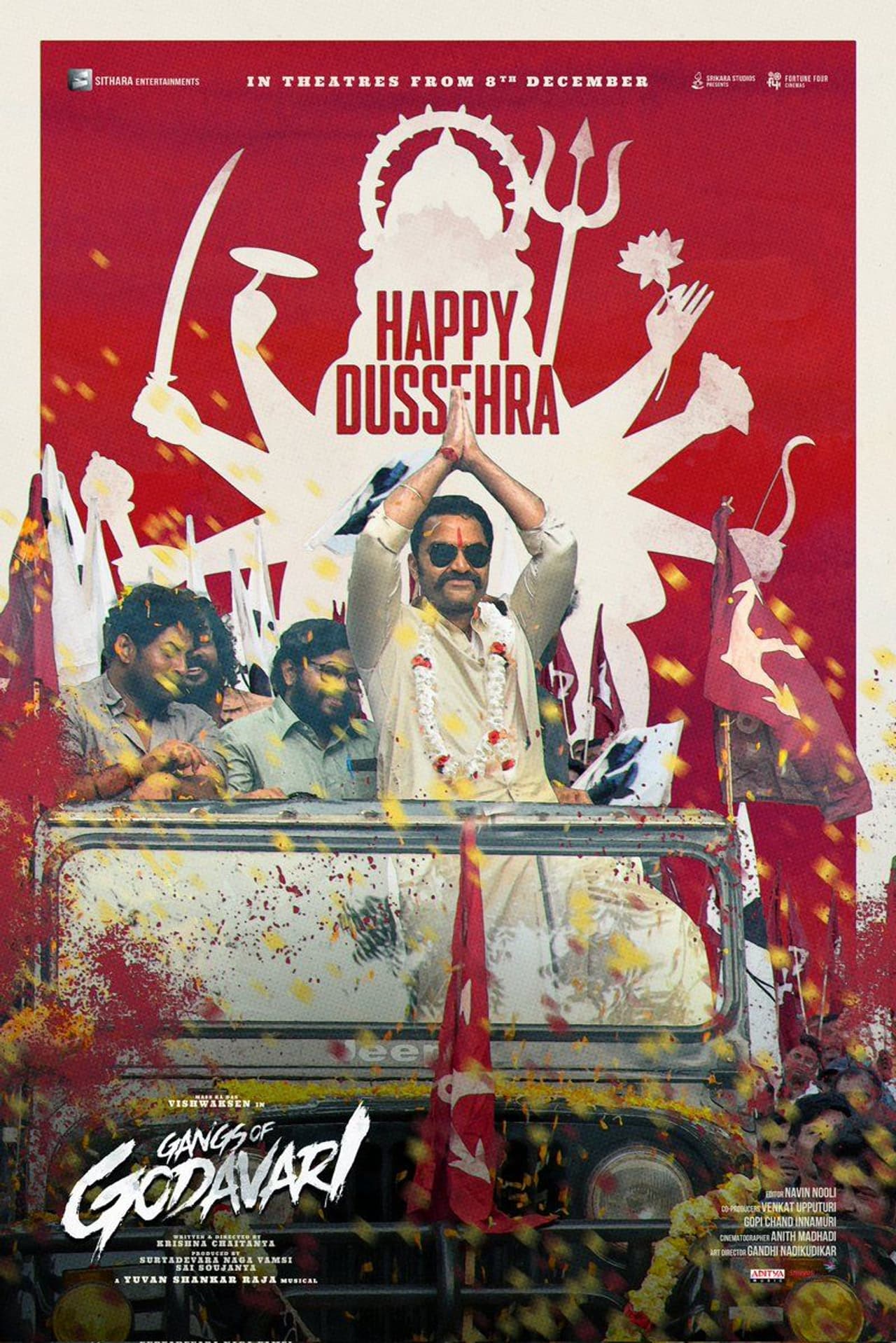 ఇప్పటికే చిత్రం నుంచి అందిన పోస్టర్లు, సాంగ్స్ సినిమాపై బజ్ ను క్రియేట్ చేశాయి. ఇక దసరా పండుగ సందర్భంగా ‘గ్యాంగ్స్ ఆఫ్ గోదావరి’ చిత్రం నుంచి ఇంట్రెస్టింగ్ పోస్టర్ ను విడుదల చేశారు. రాజకీయ ప్రచారంలో జీప్ పై ఊరేగింపుగా వస్తున్న పోస్టర్ ను రిలీజ్ చేశారు. తెల్ల చోక్కా, పట్టుపంచెలో నాయకుడిగా ఆకట్టుకుంటున్నారు. పోస్టర్లతోనే విశ్వక్ పాత్రపై యూనిట్ మరింతగా క్యూరియాసిటీ పెంచేస్తోంది.