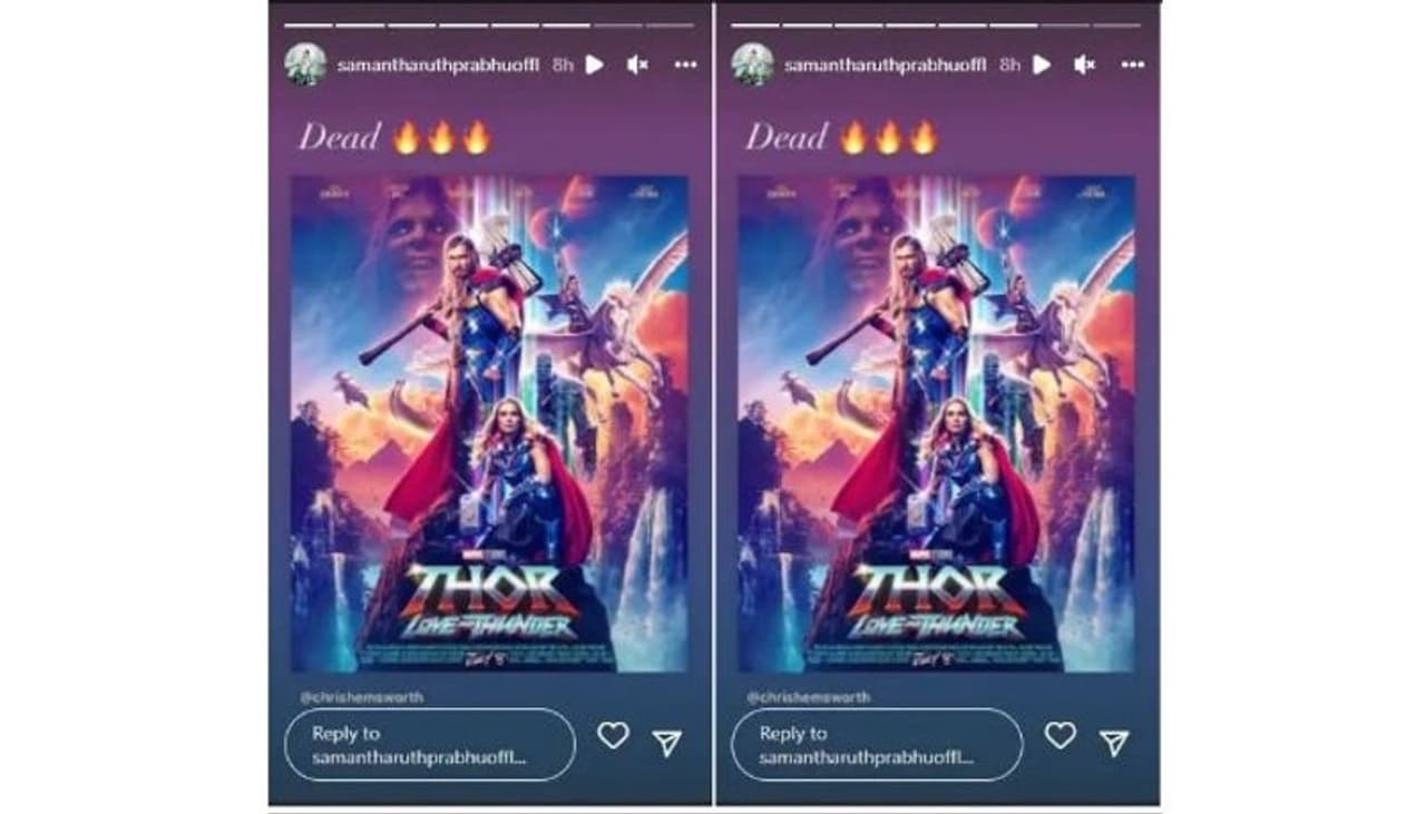 వివరాల్లోకి వెళితే...మార్వెల్ సినిమాటిక్ యూనివర్శ్ నుంచి థోర్ సిరీస్ నాలుగవ మూవీ థోర్..లవ్ అండ్ థండర్ సినిమా త్వరలో విడుదల కానుంది. జూలై 8న ప్రపంచవ్యాప్తంగా విడుదల కానున్న ఈ సినిమా ట్రైలర్ తాజాగా విడుదలైంది. ట్రైలర్ చూసిన సమంత ప్రభు ఇన్స్టాగ్రామ్ స్టోరీలో డెడ్ అని రాసి ఈమోజీలతో థోర్ సినిమా పోస్టర్ షేర్ చేసింది. డెడ్ అని పెట్టడంతో కాస్సేపటికే వైరల్ కాసాగింది. అయితే మరి కాస్సేపటికి ఆ పోస్ట్ కన్పించలేదు.