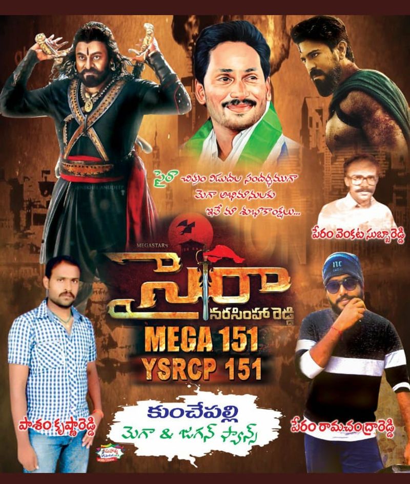 'మెగా 151.. వైసీపీ 151 అంటూ ఫ్లెకీలో పెట్టిన క్యాప్షన్ అందరిని ఆకట్టుకుంటోంది. సైరా చిత్రం చిరంజీవికి 15వ మూవీ. ఇక గత సార్వత్రిక ఎన్నికల్లో వైసీపీ 151 సీట్లతో ఘనవిజయం సాధించిన సంగతి తెలిసిందే.