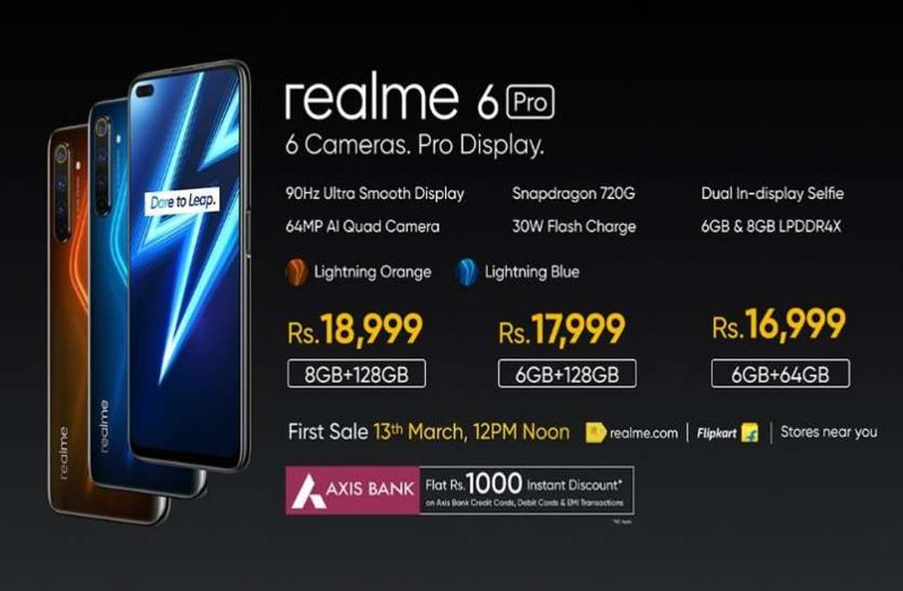 లైటనింగ్ బ్లూ, లైటనింగ్ ఆరెంజ్ రంగుల్లో రియల్ మీ 6 ప్రో ఫోన్ లభ్యం కానున్నది. ఈ నెల 13వ తేదీ మధ్యాహ్నం 12 గంటలకు ఈ-రిటైలర్ ఫ్లిప్కార్ట్, రియల్ మీ డాట్ కామ్ వెబ్ సైట్లలో ఈ ఫోన్ విక్రయానికి రానున్నది. ఆఫ్ లైన్ లోనూ విక్రయిస్తారు. రియల్ మీ 6ప్రో ఫోన్ కొనుగోలుపై యాక్సిస్ బ్యాంక్ వినియోగదారులకు రూ.1000 ఇన్స్టంట్ డిస్కౌంట్ లభిస్తుంది.