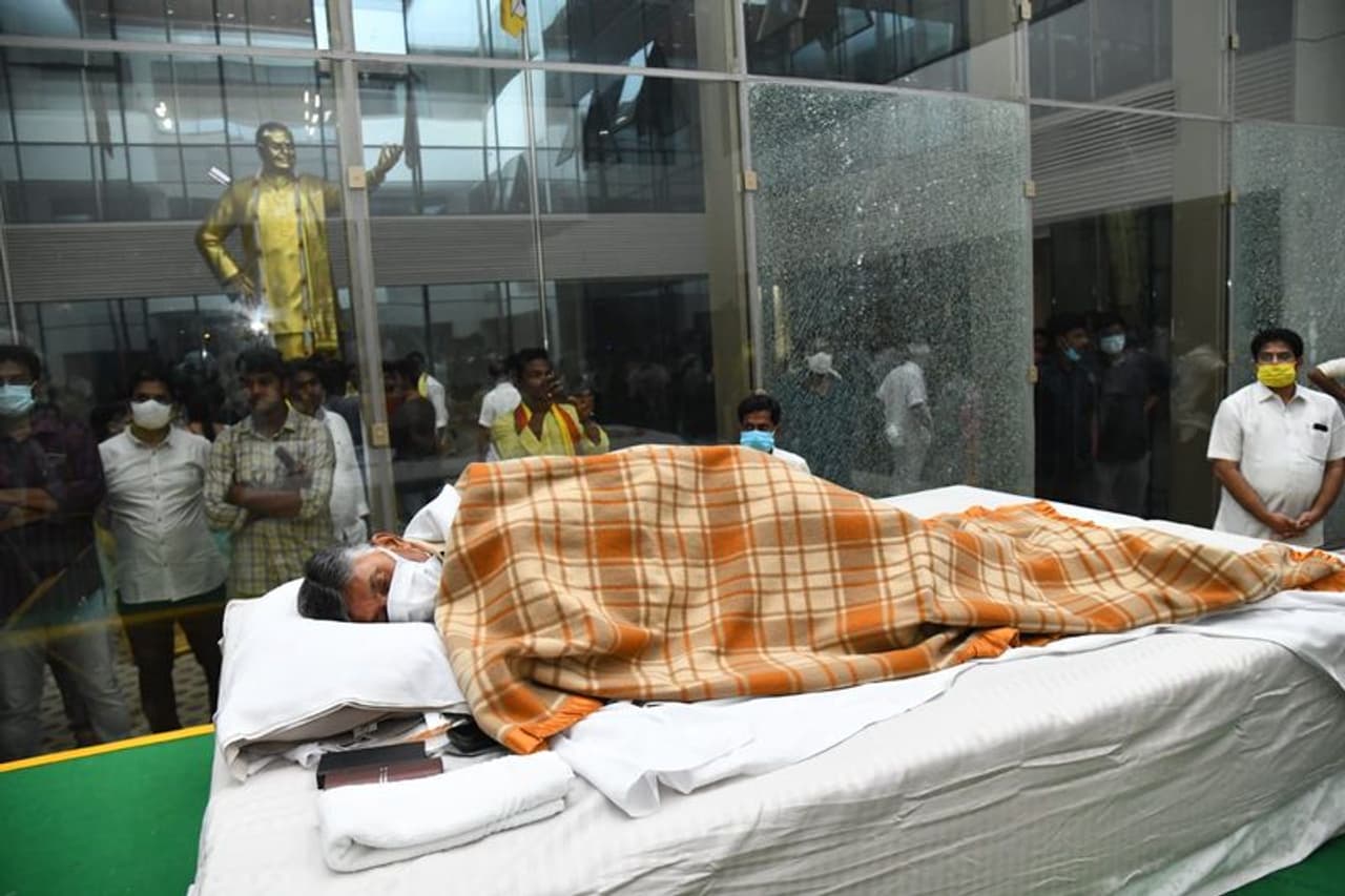 అమరావతి: తెలుగుదేశం పార్టీ జాతీయ కార్యాలయంపై దాడికి నిరసనగా ఆ పార్టీ అధినేత చంద్రబాబు నాయుడు గురువారం ఉదయం 36గంటల దీక్ష ప్రారంభించిన విషయం తెలిసిందే. పగిలిన అద్దాలు, ధ్వంసమైన ఫర్నిచర్ మధ్యలోనే దీక్షకు కూర్చున్న చంద్రబాబు రాత్రి అదే వేదికపై నిద్రపోయారు. ప్రభుత్వ ఉగ్రవాదంపై పోరు పేరుతో పార్టీ కార్యాలయంలో ప్రారంభమైన ఈ దీక్ష 36 గంటలపాటు కొనసాగనుంది.