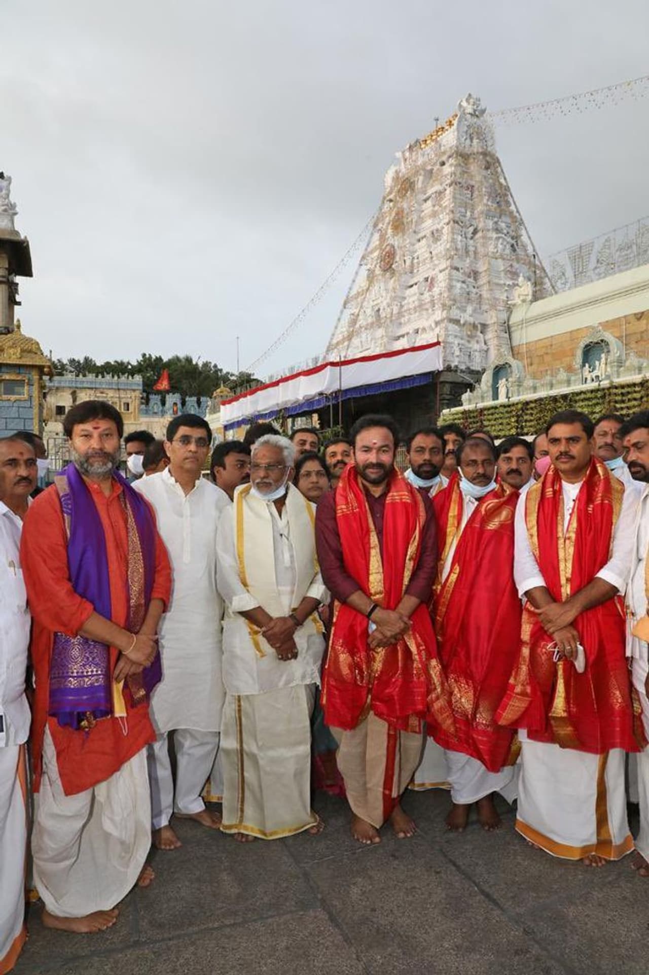 తిరుమలకు చేరుకున్న కిషన్ రెడ్డికి టిటిడి ఛైర్మన్ వైవి.సుబ్బారెడ్డి స్వాగతం పలికారు. కేంద్ర మంత్రితో పాటు ఏపీ డిప్యూటీ సీఎం నారాయణస్వామి, మంత్రి బుగ్గన రాజేంద్రనాథ్రెడ్డి, మహారాష్ట్ర హైకోర్టు న్యాయమూర్తి జస్టిస్ దామా శేషాద్రి నాయుడు, బీజేపీ ఏపీ అధ్యక్షుడు సోము వీర్రాజు తదితరులు స్వామివారిని దర్శించుకున్నారు. వీరందరికి టిటిడి ఛైర్మన్ దగ్గరుండి దర్శనం చేయించారు.