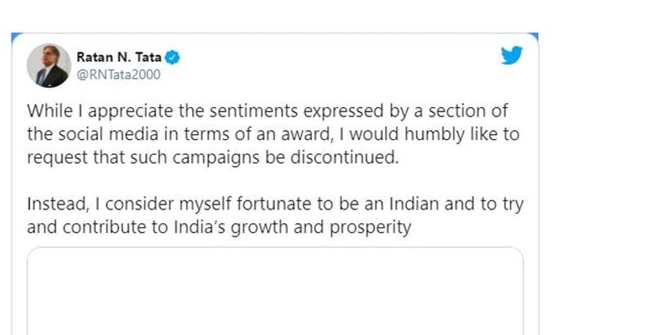 ఈ ప్రచారాన్ని ఆపాలని విజ్ఞప్తి చేస్తూ రతన్ టాటా తన ట్వీట్ లో "ఒక అవార్డు కోసం సోషల్ మీడియాలో ప్రజలు వ్యక్తం చేసిన మనోభావాలను నేను అభినందిస్తున్నాను, అయితే అలాంటి ప్రచారాలు ఆపివేయాలని నేను వినయంగా విజ్ఞప్తి చేస్తున్నాను. నేను భారతీయునిగా ఉండటం, భారతదేశ పురోగతి, శ్రేయస్సుకు దోహదపడే అదృష్టవంతుడిని అంటూ పోస్ట్ పెట్టారు.