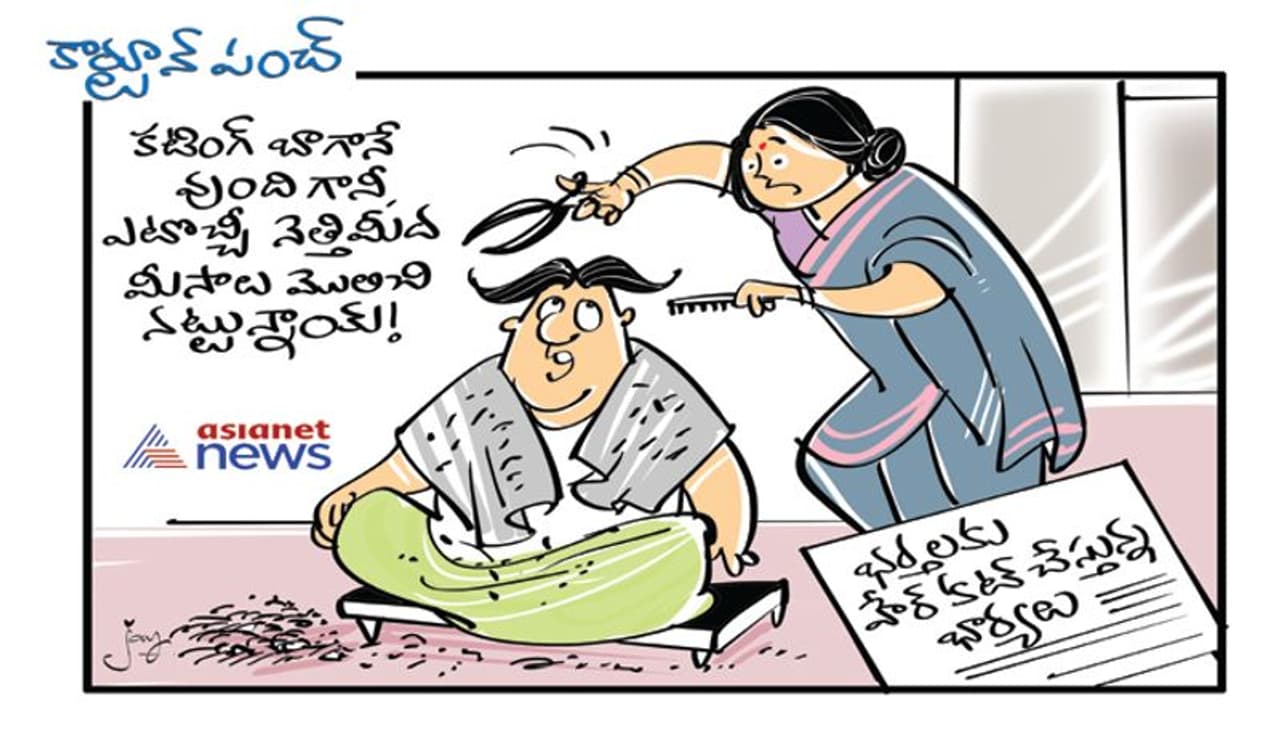 భర్తలకు హెయిర్ కట్ చేస్తున్న భార్యలు