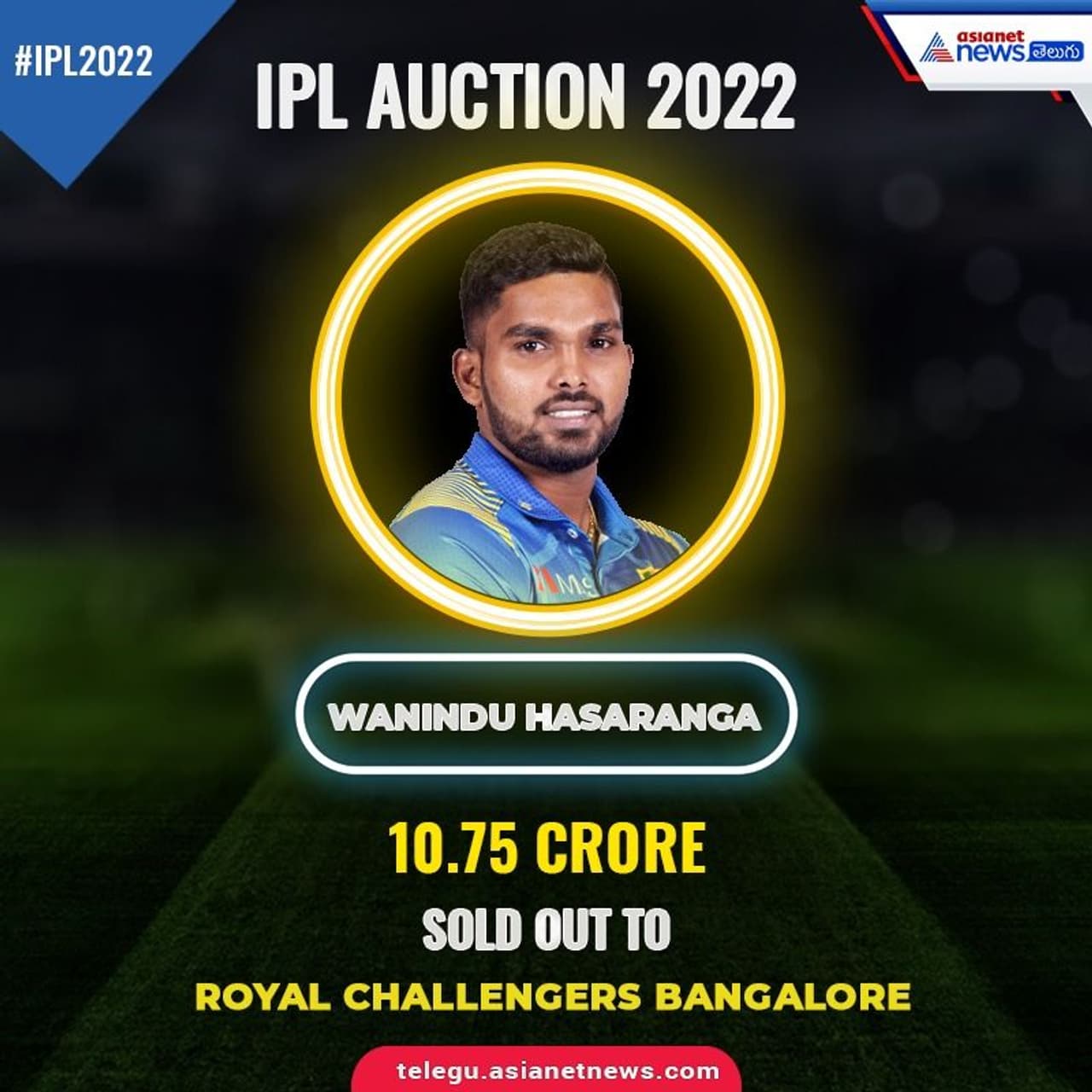 శ్రీలంక ఆల్రౌండర్ వానిందు హసరంగను రూ.10.75 కోట్లకు దక్కించుకుంది రాయల్ ఛాలెంజర్స్ బెంగళూరు. యజ్వేంద్ర చాహాల్ను బడ్జెట్ కారణాలతో రిటైన్ చేసుకోని ఆర్సీబీ, హసరంగ కోసం ఇంత మొత్తం చెల్లించేందుకు సిద్ధం కావడం ఆశ్చర్యానికి గురి చేసింది.