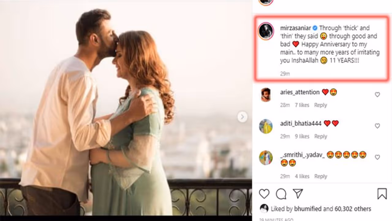 భారత టెన్నిస్ స్టార్ సానియా మీర్జా, పాక్ క్రికెటర్ షోయబ్ మాలిక్ల వివాహా బంధానికి 11 ఏళ్లు పూర్తయ్యాయి. ఈ సందర్భంగా భర్తకు విషెస్ తెలుపుతూ ఓ పోస్టు చేసింది సానియా మీర్జా మాలిక్...