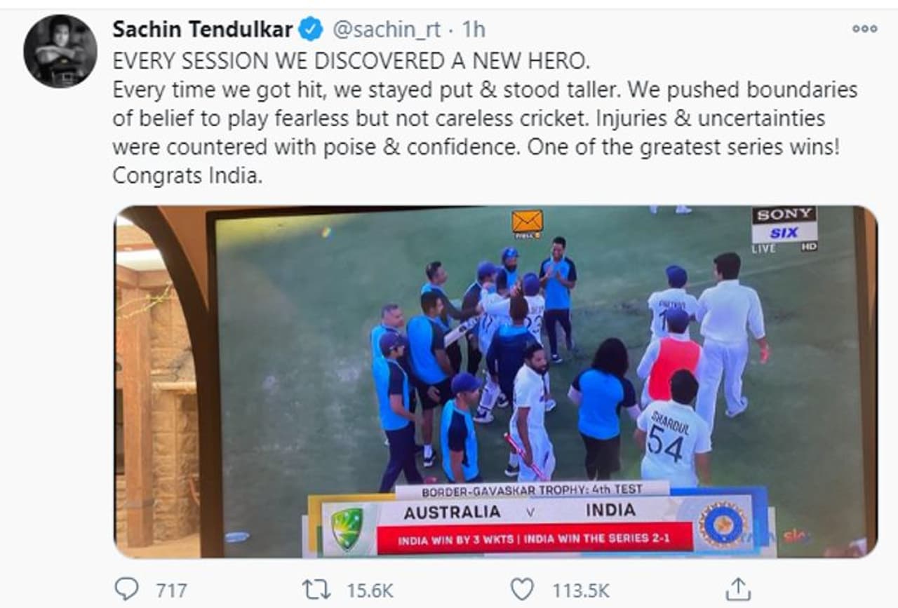 ‘ప్రతీ సెషన్లో మనం ఓ కొత్త హీరోని కనుగొన్నాం. గాయపడిన ప్రతీసారి, నిలబడి, మరింత ఎత్తుకి ఎదిగాం... భయపడకుండా ఆడగలమని బౌండరీలు బాది నిరూపించాం, అంతేకాని నిర్లక్ష్యంగా ఆడమని చూపించాం. గాయాలు, ఇబ్బందులన్నీ నమ్మకం, కసితో తుడుచుకుపోయాయి. వన్ ఆఫ్ ది గ్రేటెస్ట్ సిరీస్ విన్... కంగ్రాట్స్ ఇండియా’ అంటూ ట్వీట్ చేశాడు సచిన్ టెండూల్కర్.