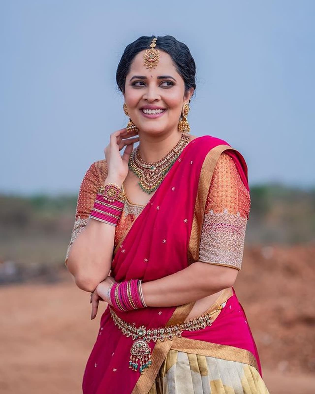ఈ ఫొటోల్లో అనసూయ చాలా అట్రాక్టివ్ గా కనిపిస్తోంది. లెహంగా వోణీలో అచ్చమైన తెలుగమ్మాయి అందాలను చూపిస్తోంది. ప్రకావంతమైన మొహంపై చిరునవ్వు పూయించిందీ బ్యూటీ. మ్యాచింగ్ జూవెల్లరీ, బ్యాగిల్స్ లో తన అందం రెట్టింపు అయ్యింది.