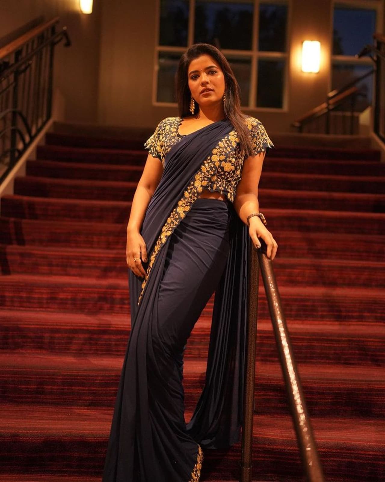 తన వ్యక్తిగత విషయాలను ఎప్పుడూ పంచుకుంటూనే వస్తున్న ఈ ముద్దుగుమ్మ.. మరోవైపు ట్రెడిషనల్ వేర్స్ లో అదిరిపోయేలా ఫొటోషూట్లు చేస్తూ అదరగొడుతోంది. లేటెస్ట్ గా ఈ బ్యూటీ చీరకట్టులో మెరిసింది. బ్లూ కలర్ శారీలో బ్యూటీఫుల్ లుక్ ను సొంతం చేసుకుంది.