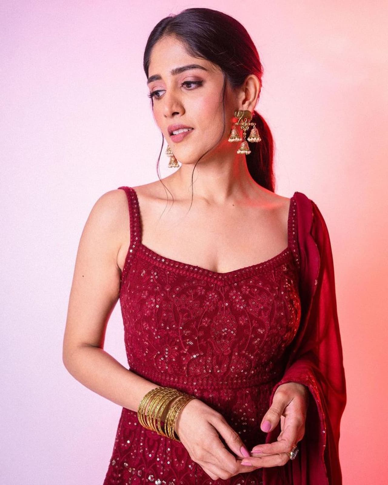 లేటెస్ట్ ఫొటోషూట్ లో చాందిని మెరూన్ కలర్ చుడీదార్ లో మెరిసింది. బ్యూటీఫుల్ లుక్ ను సొంతం చేసుకున్న ఈ ముద్దుగుమ్మ స్లీవ్ లెస్ అందాలతో అదరగొట్టింది. గ్లామర్ మెరుపులతో చూపుతిప్పుకోకుండా చేసింది. అలాగే క్యూట్ స్మైల్ తో కట్టిపడేసింది.