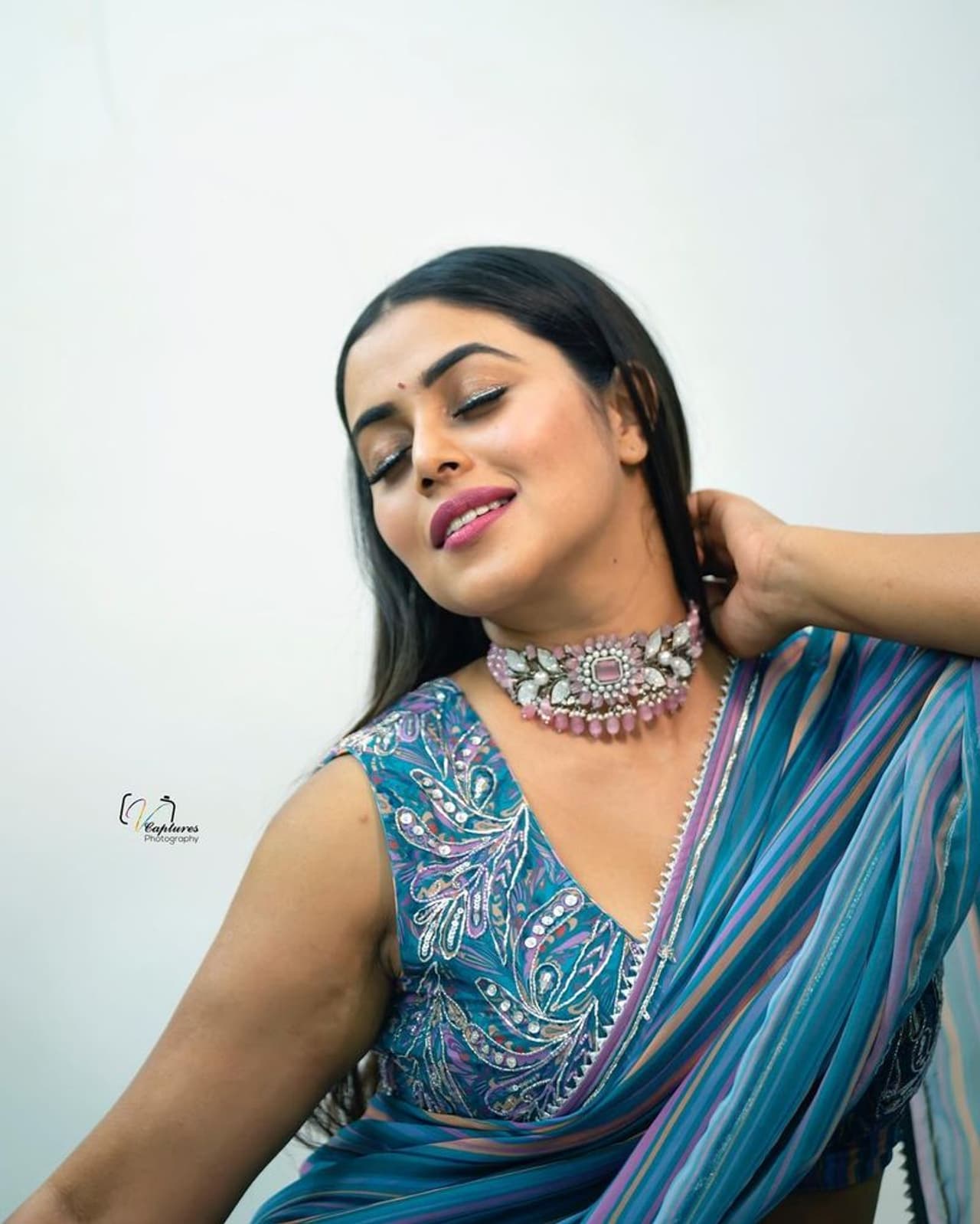 తాజాగా పూర్ణ బ్లూ శారీలో వయ్యారంగా గ్లామర్ మెరుపులు మెరిపిస్తూ పిచ్చెక్కిస్తోంది. సిట్టింగ్ ఫోజుల్లో పూర్ణ యమా హాట్ గా ఇస్తున్న లుక్స్ యువతకి కనుల విందు చేస్తున్నాయి.