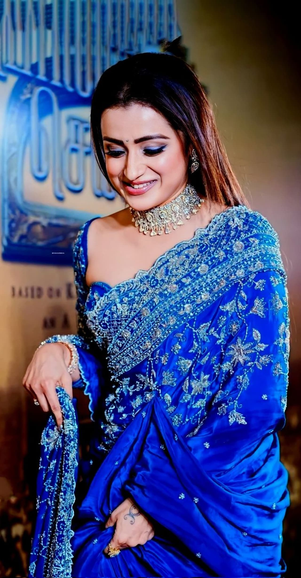 బ్లూ శారీలో మెరిసిపోతున్న త్రిష.. చీరకట్టులో కుందవై మెరుపులు.. క్యూట్ స్మైల్ తో చంపేస్తున్న సీనియర్ భామ..