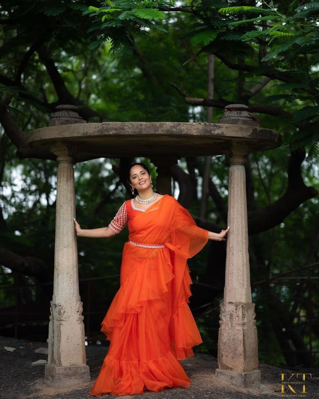 తాజాగా అనసూయ ఆరెంజ్ డిజైనర్ శారీలో కళ్ళు మిరిమిట్లు గొలిపే విధంగా ఇచ్చిన ఫోజులు స్టన్నింగ్ అనిపిస్తున్నాయి. పచ్చని చెట్ల మధ్య అనసూయ వయ్యారాలు ఒలికిస్తూ ఈ ఫోజులు ఇచ్చింది.