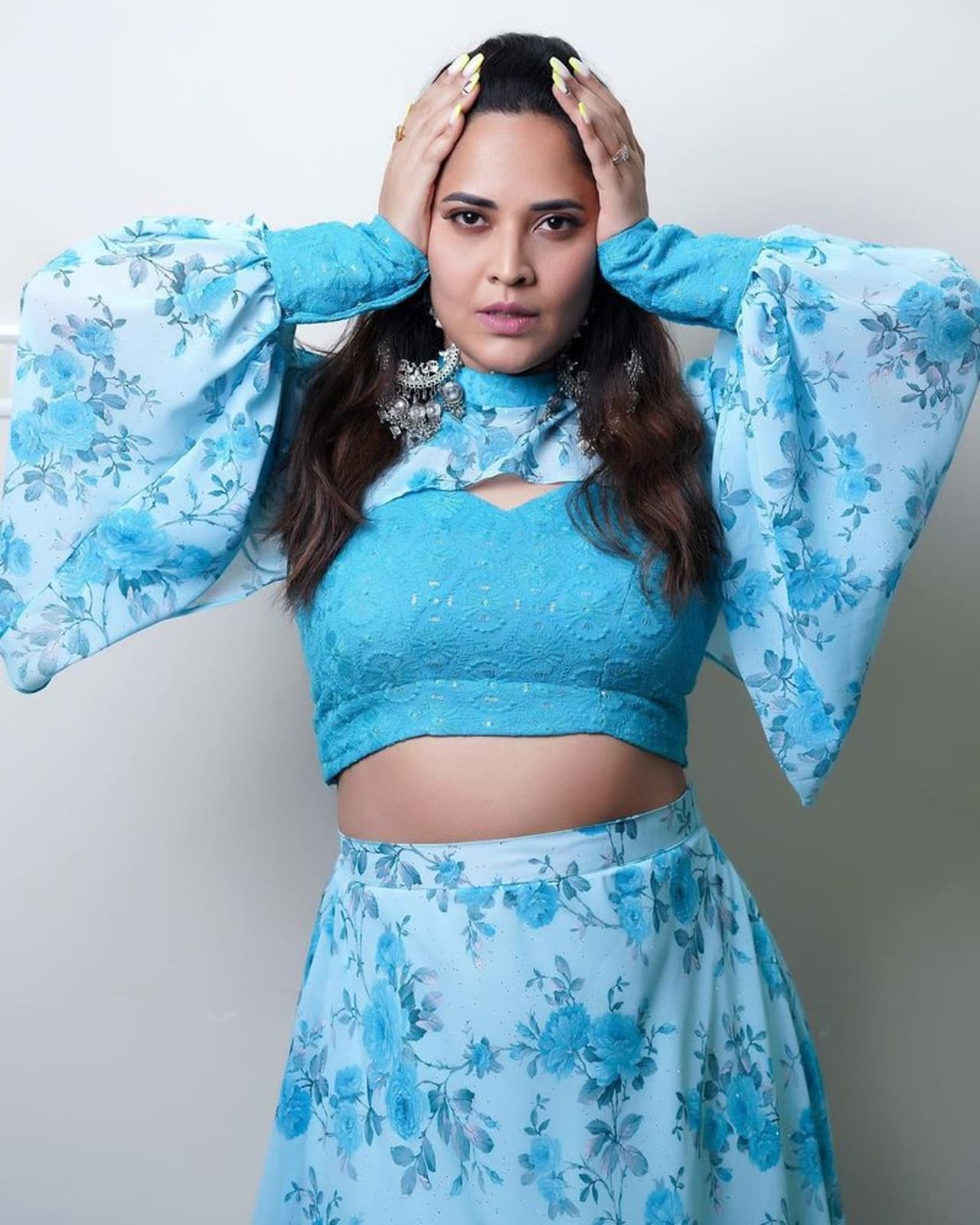 తాజాగా అనసూయ బ్లూ డ్రెస్ లో దర్శనమిచ్చింది. బిగుతైన టాప్, లెహంగాలో బ్యూటీఫుల్ లుక్ ను సొంతం చేసుకకుంది. ఈ సందర్భంగా మత్తెక్కించేలా అనసూయ ఫోజులిచ్చింది. చేతులు పైకెత్తి చూపుతిప్పుకోకుండా చేసింది. చిలిపి పోజులతో కవ్వించింది.