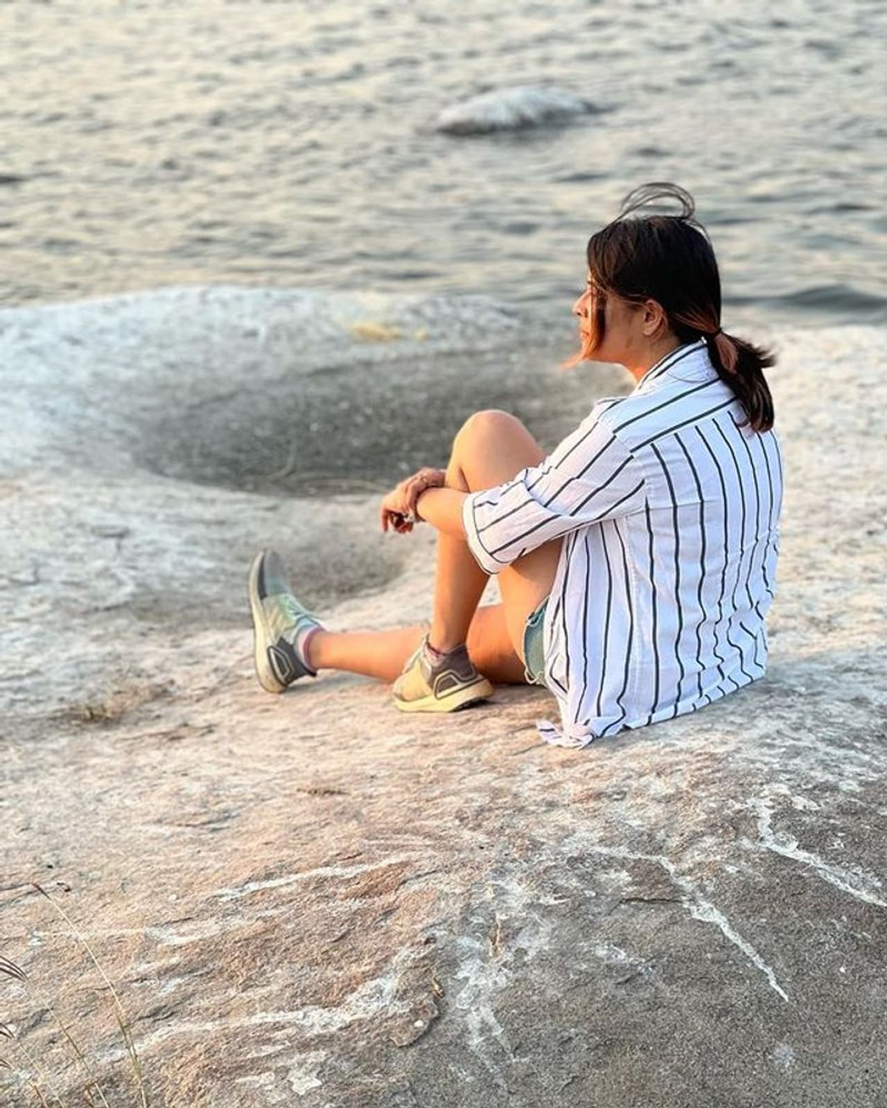 అందులో భాగంగా తన స్ట్రెస్ ను పొగొట్టుకునేందుకు ఈ వీకెండ్ ను నేచర్ తో స్పెండ్ చేసింది. చెరువు గట్టుకు రాతిపై కూర్చొని నేచర్ అందాలను, ప్రశాంతతను ఆస్వాదిస్తోంది. మరోవైపు పొట్టి నెక్కర్, స్లీవ్ లెస్ టీషర్ట్ , ఆపైన షర్ట్ ధరించి గ్లామర్ షోను మాత్రం మరిచిపోలేదు. తన ఎద అందాలను చూపిస్తూ.. సూర్యుడికే చెమటలు పట్టిస్తోంది.