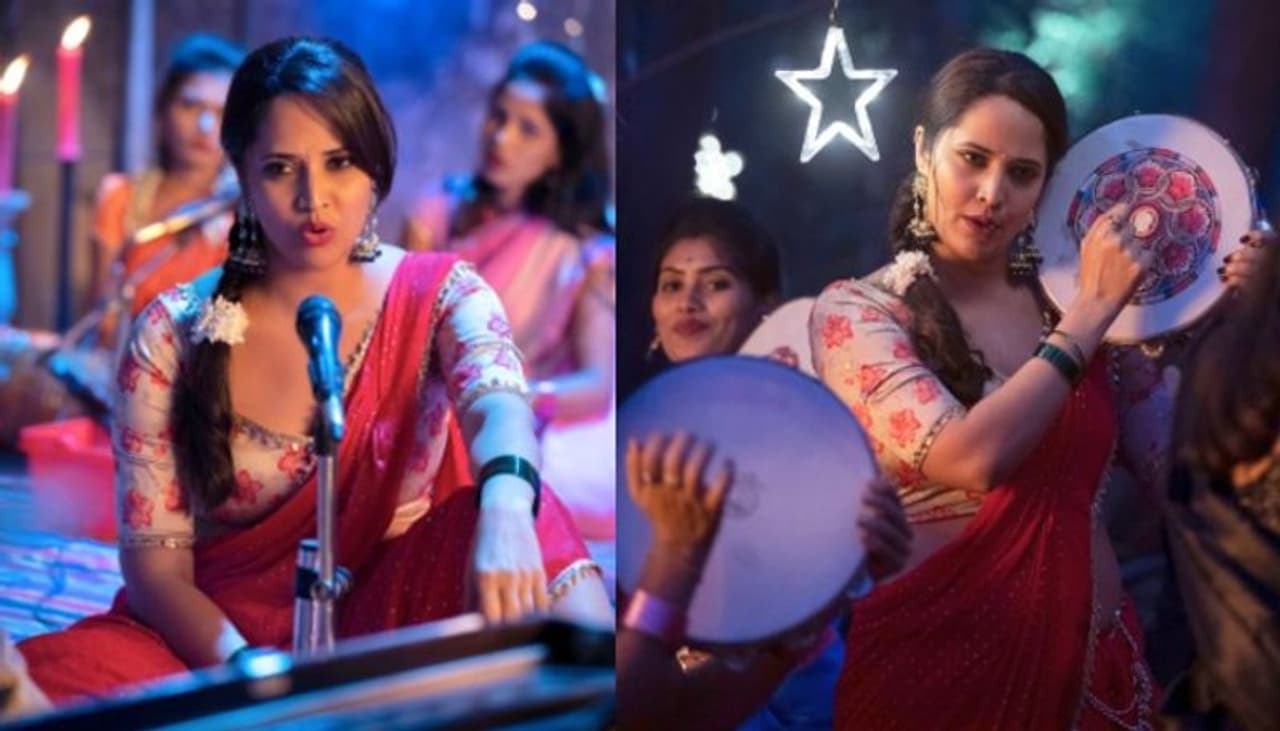 ఇందులో అనసూయ సంగీత్ తరహాలో ఓ ఐటెమ్ సాంగ్ చేస్తుందని అర్థమవుతుంది. చేతిలో డప్పు పట్టుకుని దరువేస్తుంది.