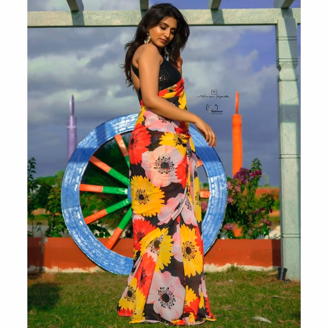 ఇక సోషల్ మీడియాలో ఎప్పటిలాగే వర్షిణి హాట్ ఫోటో షూట్స్ తో రచ్చ చేస్తున్నారు. పూల చీర, స్లీవ్ లెస్ జాకెట్ లో హాట్ హాట్ ఫోజులిచ్చారు అమ్మడు.