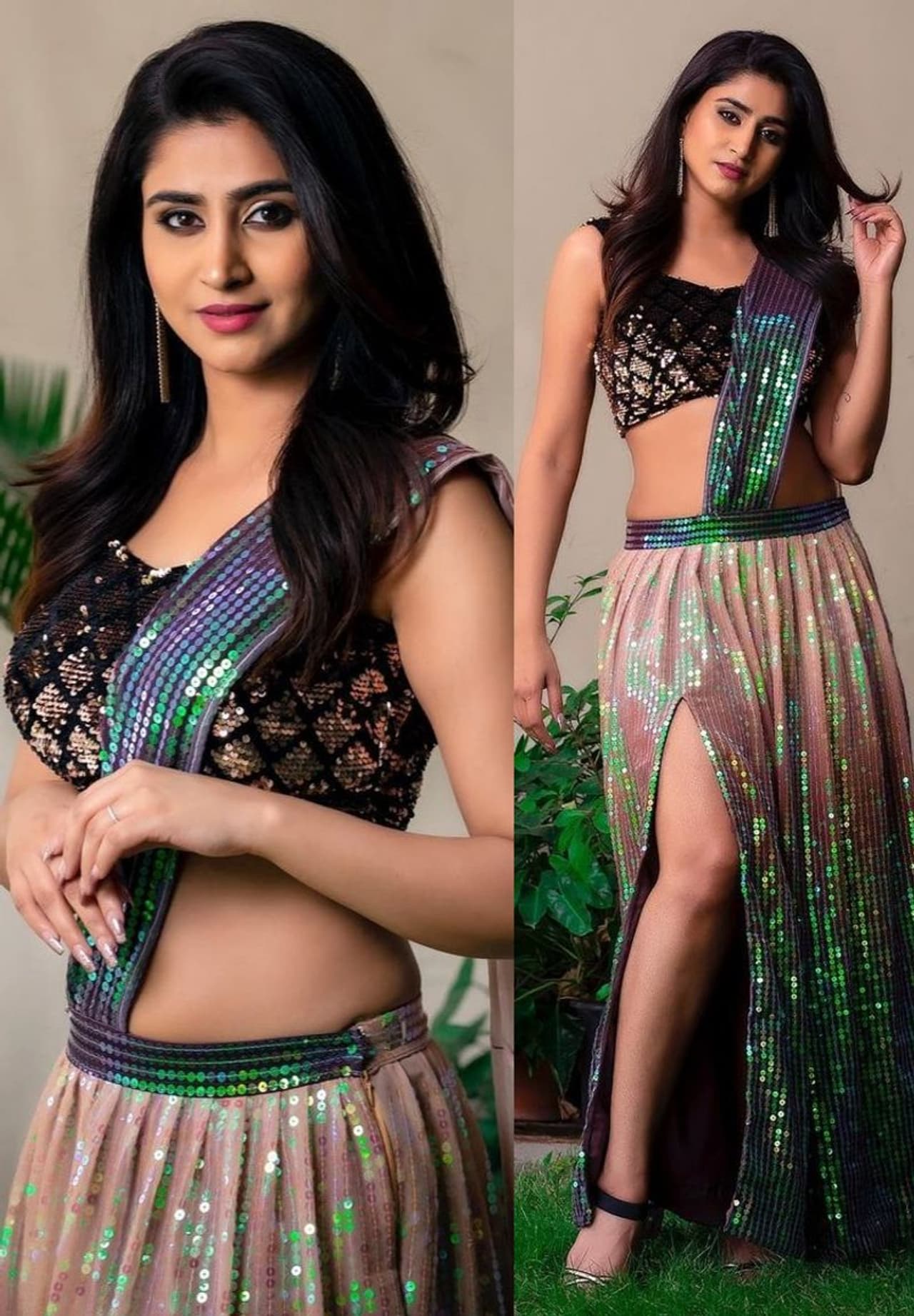 మెరుపుల జాకెట్, ఫ్రాక్ వేసుకున్న వర్షిణి నడుము వంపులతో పాటు, సొగసైన కాళ్ళ సోయగాలను వడ్డించేసింది. నాజూకైన వర్షిణి నడుము అందాలను చాలీ చాలని పైట దాచలేక పోయింది. దీంతో మనసు పారేసుకోవం ఆమె ఫ్యాన్స్ వంతైంది.
