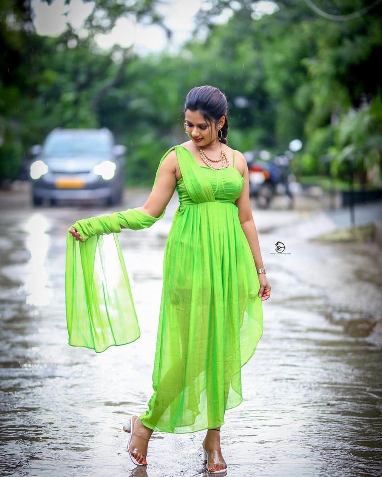 తాజాగా అరియనా వయ్యారంగా చేసిన ఫోటో షూట్ చూస్తే కుర్రాళ్ల మతి చెడిపోవడం ఖాయం. వర్షం పడిన నడిరోడ్డుపై చల్లటి వాతావరణంలో తన గ్రీన్ డ్రెస్ తో మురిపించే ప్రయత్నం చేసింది అరియనా.