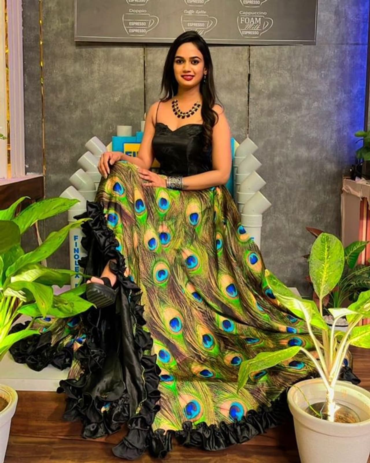 తాజాగా నెమలి కనుల ప్రింటెండ్ లెహంగా, బ్లాక్ టాప్ లో దర్శనమిచ్చింది. ఈ డ్రెస్ లో అరియానా మరింత ఆకర్షణీయంగా కనిపిస్తోంది. పీకాక్ డ్రెస్ లో మరింతగా మెరిసిపోతుందంటూ నెటిజన్లు కామెంట్లు పెడుతున్నారు. లైక్స్, కామెంట్లతో పిక్స్ ను వైరల్ చేస్తున్నారు.