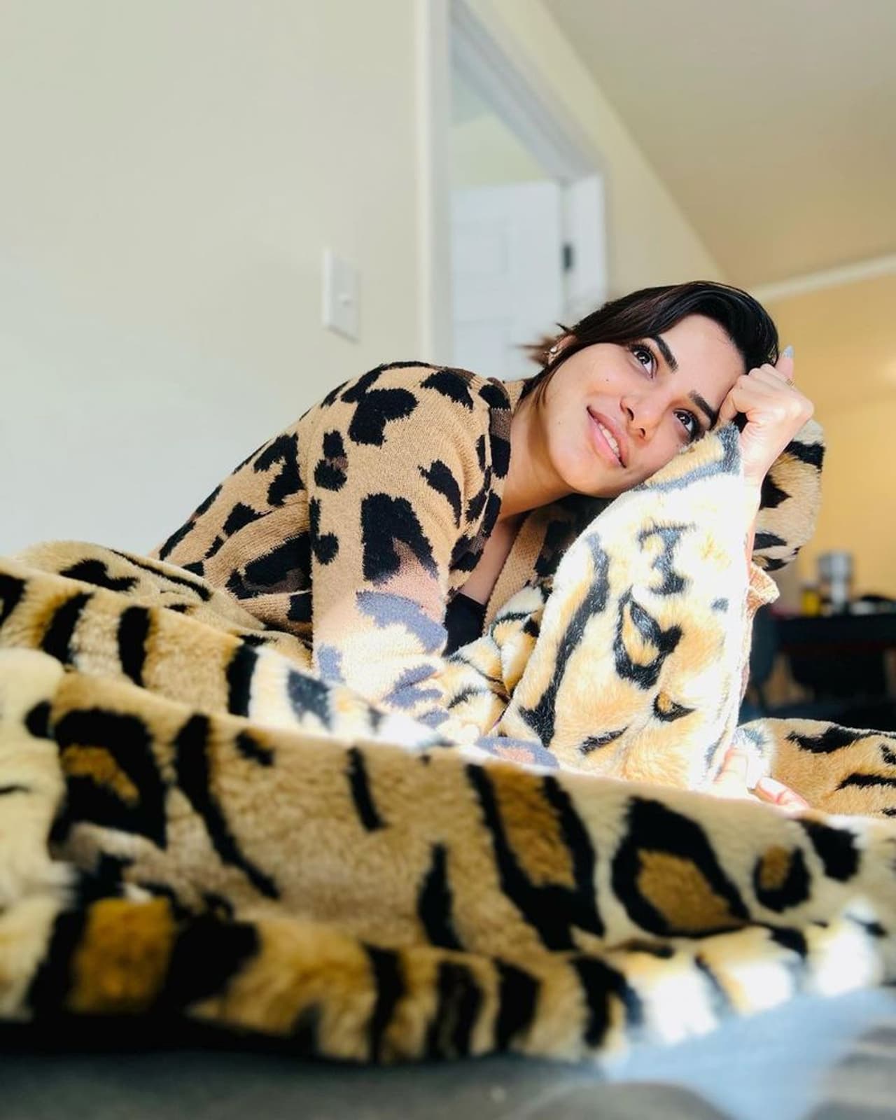 ఆషురెడ్డి ప్రస్తుతం అమెరికాలో ఉంది. ఓ ఈవెంట్ కోసం యూఎస్ వెళ్లిన ఈ భామ అక్కడ ఉష్ణోగ్రతలు భారీగా పడిపోయాడట. చలి వణికిస్తుందని చెప్పింది ఆషు రెడ్డి. దీంతో పులి చర్మాన్ని పోలిన దుప్పటి కప్పుకుంది. చలి నుంచి రక్షించుకుంటూ వెచ్చదనం పొందుతుంది.