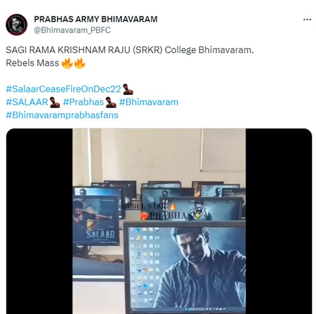 తాజాగా భీమవరంలో ప్రభాస్ అభిమానులు తమ ప్రత్యేకత చాటుకున్నారు. భీమవరంలోని SRKR ఇంజనీరింగ్ కాలేజీలో విద్యార్థులు తమ కంప్యూటర్ ల్యాబ్ లో అన్ని సిస్టమ్స్ లో సలార్ వాల్ పేపర్లు పెట్టి ఆ దృశ్యాలని సోషల్ మీడియాలో పోస్ట్ చేశారు.