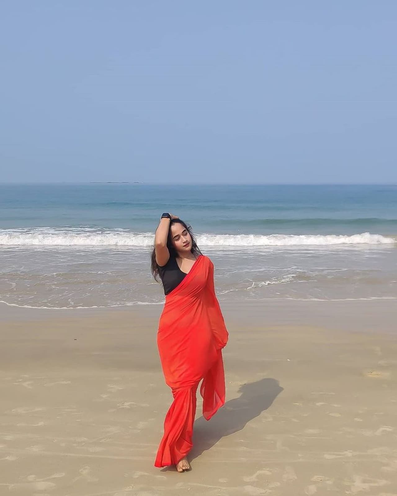 ఎర్ర చీరలో బీచ్ ఒడ్డున అందాలు ఆరబోస్తూ