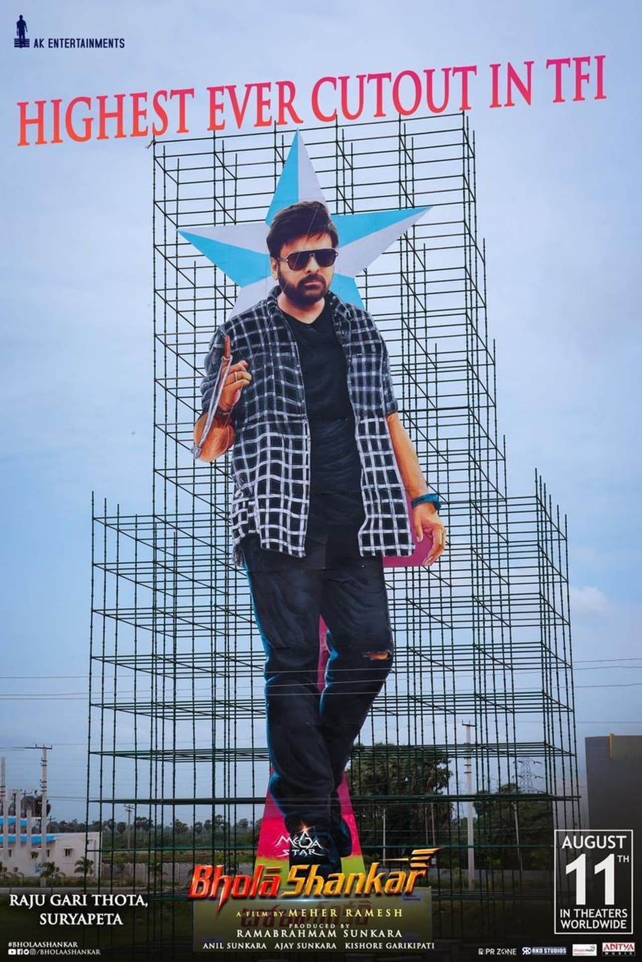 మెగా స్టార్ చిరంజీవి - మెహర్ రమేశ్ కాంబినేషన్ లో రూపుదిద్దుకుంటున్న చిత్రం ‘భోళా శంకర్’. తమన్నా భాటియా కథానాయిక. కీర్తి సురేష్ చిరుకు చెల్లెలి పాత్రలో నటించింది. ఏకే ఎంటర్ టైన్ మెంట్ బ్యానర్ పై రూపుదిద్దుకుంటున్న ఈ సినిమా ఆగస్టు 11న ప్రపంచ వ్యాప్తంగా రిలీజ్ కానుంది. రెండు వారాల్లో రిలీజ్ కాబోతుండటంతో ప్రమోషన్స్ లో జోరు పెంచారు. ఈ సందర్భంగా మునుపెన్నడూ లేని విధంగా చిరంజీవి భారీ కటౌట్ ను ఏర్పాటు చేశారు. 100 ఫీట్ల చిరంజీవి కటౌట్ ను ‘రాజు గారి తోట, సూర్యపేట’లో ఏర్పాటు చేశారు. దీంతో తెలుగు చిత్ర పరిశ్రమలోనే హ్యాయెస్ట్ కటౌట్ గా రికార్డు క్రియేట్ చేశారు.