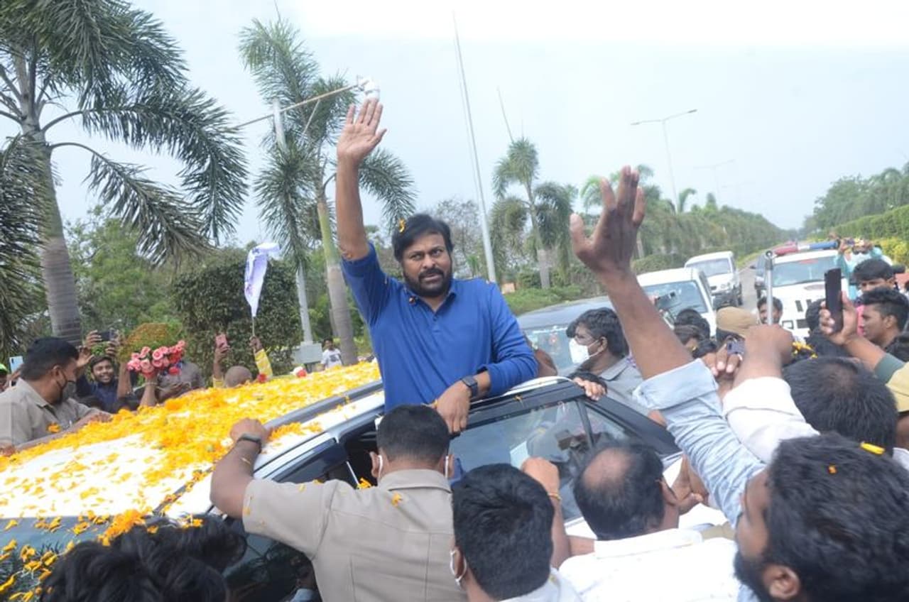 అభిమానుల ఉత్సహాం తీర్చడం కోసం కారు పైనుండి చిరంజీవి అభివాదం చేశారు. అందరి వైపు ఆయన పలకరింపుగా చూశారు.
