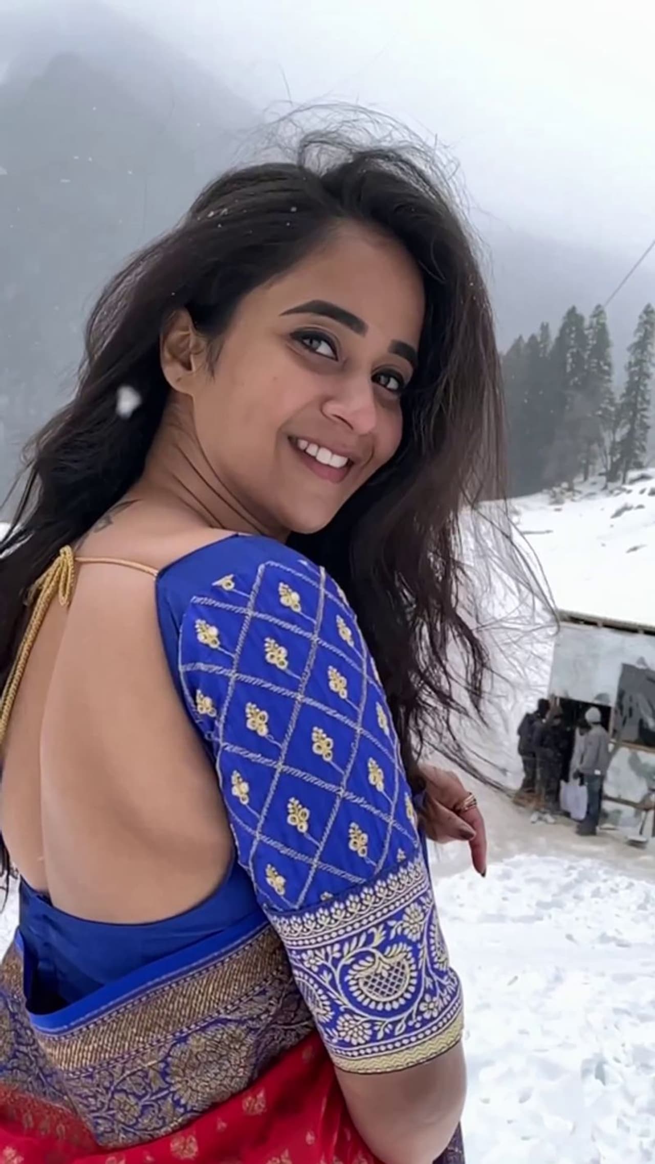 రెడ్ శారీలో గెంతుతూ అక్కడ మంచుతో ఆడుకుంటూ దీప్తి సునైనా ఇస్తున్న ఫోజులు అదుర్స్ అని చెప్పాలి. దీప్తి సునైనా ఇస్తున్న ఫోజులు యువతని మెస్మరైజ్ చేస్తున్నాయి. కొంచెం కొంచెం క్లీవేజ్ సొగసు ఒలికిస్తూ టీజింగ్ చేస్తోంది.