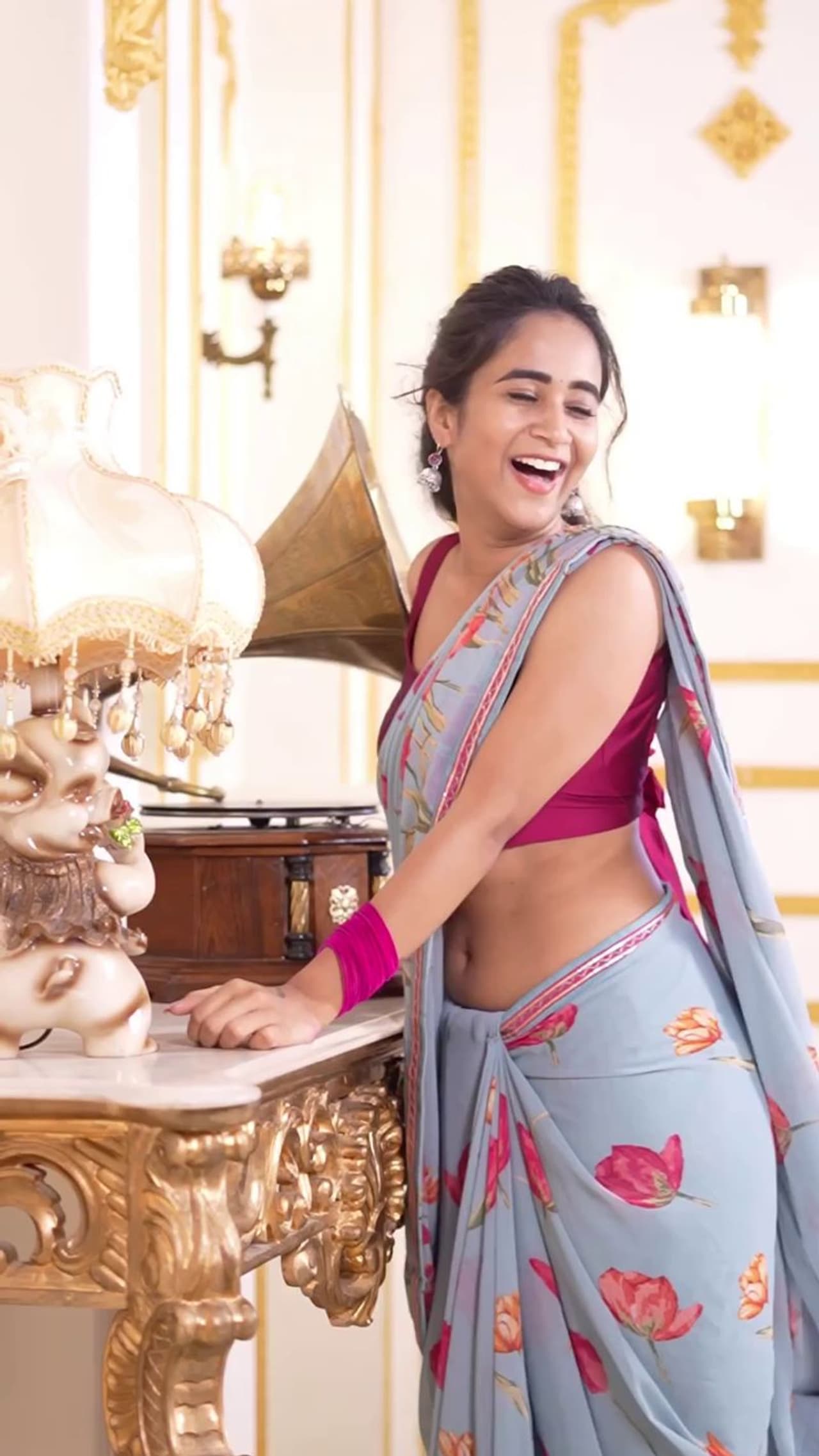 అటు ఇటు జింక పిల్లలా గెంతుతూ అన్ని యాంగిల్స్ లో ఫోటో షూట్ చేసింది. చీర ధరించింది కాబట్టి.. కుర్రాళ్లు కోరుకునేలా నడుము అందాలు చూపించడం కోసం కావాలనే కొంగు పక్కకి జరుపుతూ ఫోజులు ఇచ్చింది.