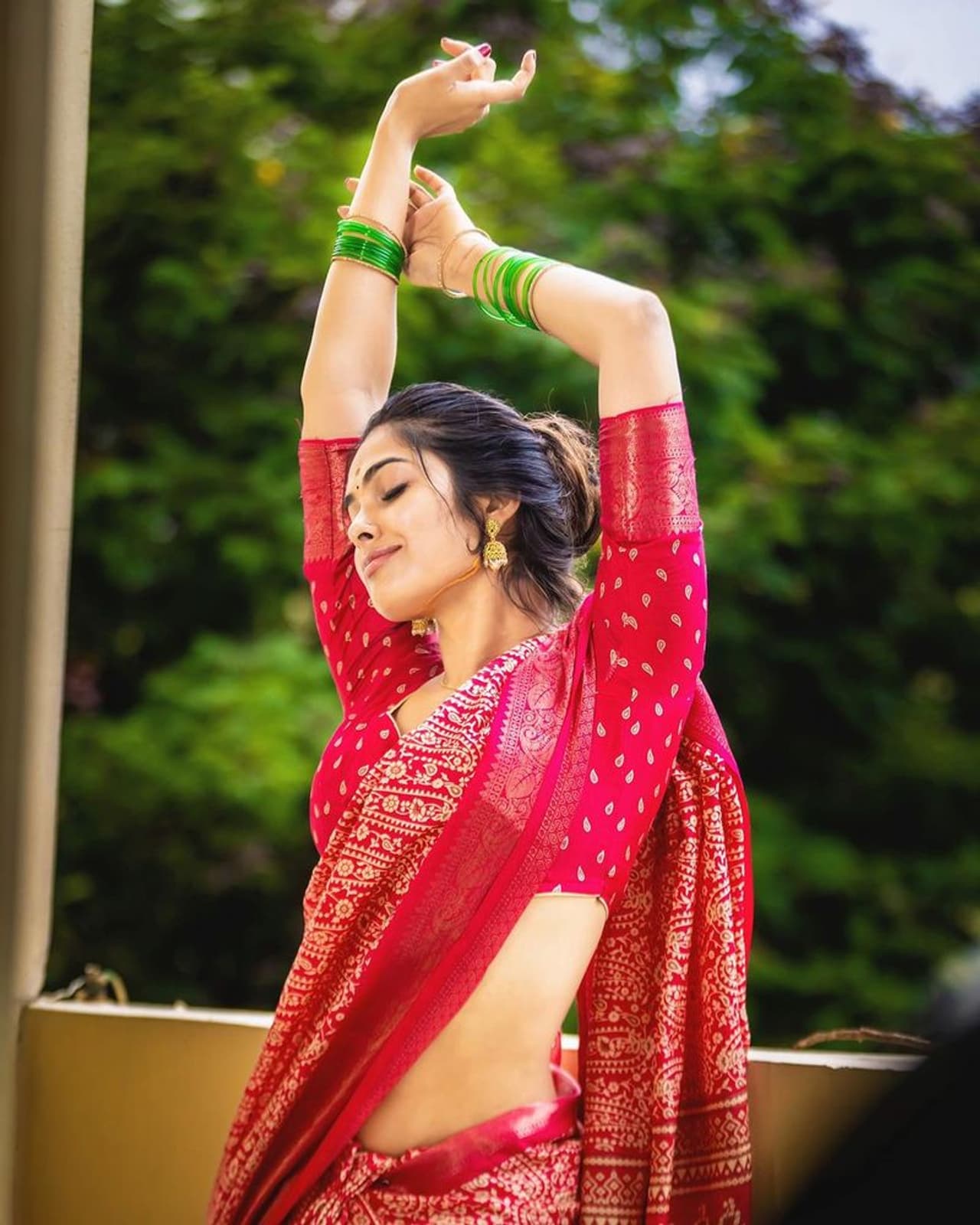- సన్నని నడుము చూపిస్తూ విరహంతో చెలరేగిపోతున్న దివి.. సిల్క్ శారీలో చేతులు పైకెత్తి మత్తెక్కించే పోజులు..