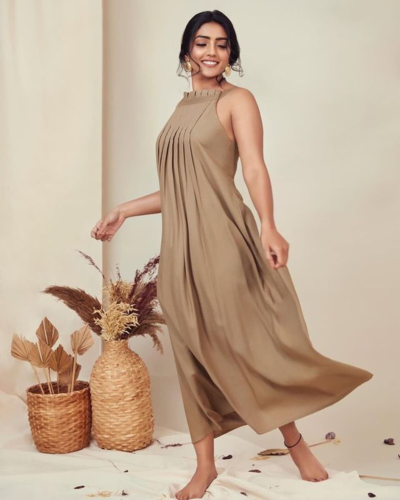 బ్రౌన్ కలర్ స్లీవ్ లెస్ గౌనులో పులకింత వచ్చినట్లు ఈషా రెబ్బా అందంతో మెరిసిపోతోంది. ఈ డ్రెస్ ఈషా రెబ్బా కు పర్ఫెక్ట్ గా సెట్ అయిందనే చెప్పాలి. టాప్ టూ బాటమ్ అందంతో కనివిందు చేస్తోంది. కుర్రాళ్ళు మెస్మరైజ్ అయ్యేలా చిరునవ్వులు చిందిస్తూ ఫోజులు ఇచ్చింది.