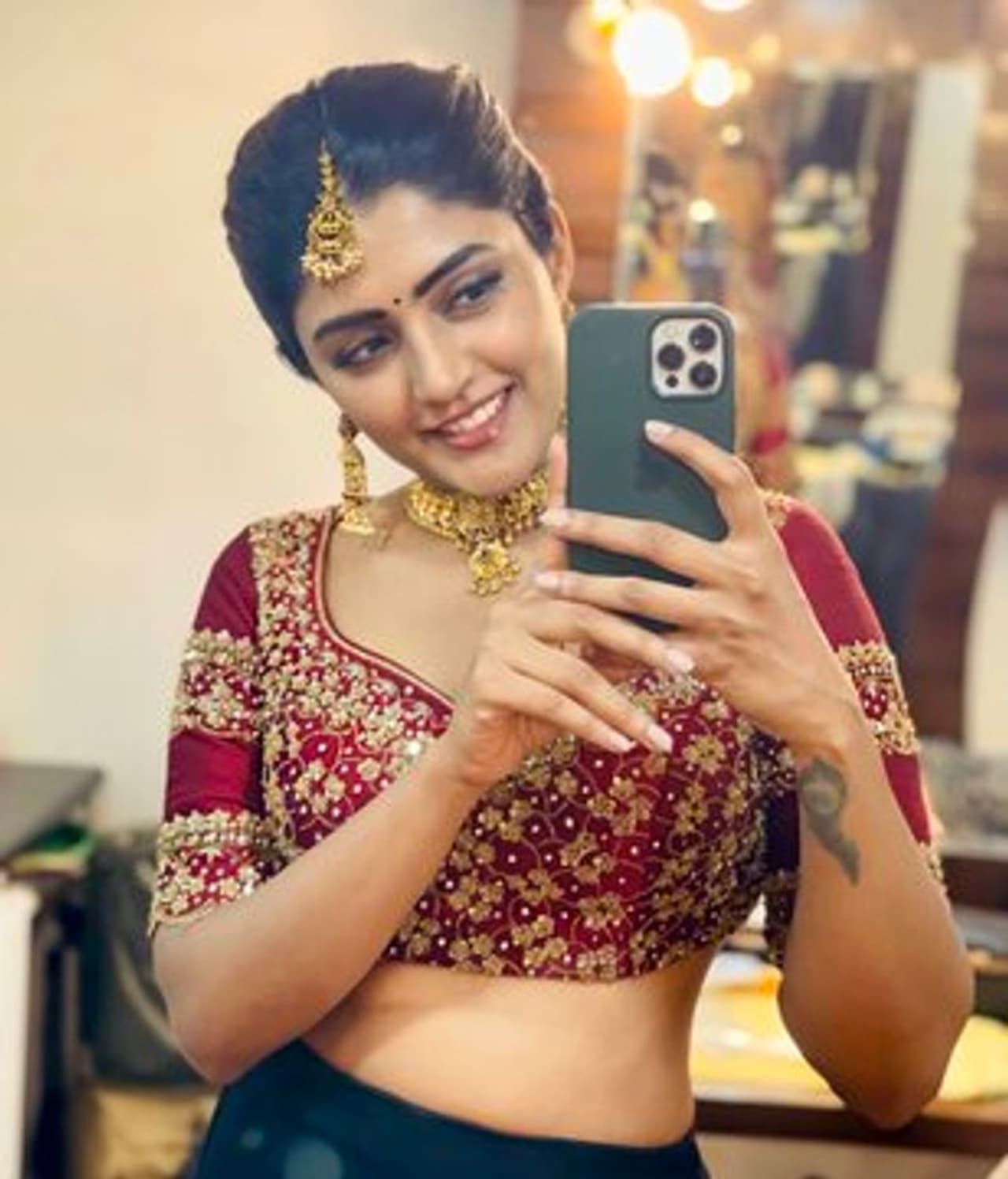 ఓరుగల్లుకు చెందిన ఈ హీరోయిన్ పండుగ పూట అభిమానులకు గులాంబీ రంగు అంచు, క్రీమ్ కలర్ కలిసిన చీరలో దర్శనిమిచ్చింది. చేతిలో దేవుడి ప్రతిమలను పట్టుకొని తన ముఖంపై చిరువు నవ్వును పూయించింది ఈ అందాల సుందరి. నడుముకు వడ్డానం ధరించడంతో మరింత అందాన్ని తన సొంత చేసుకుంది ఇషా.