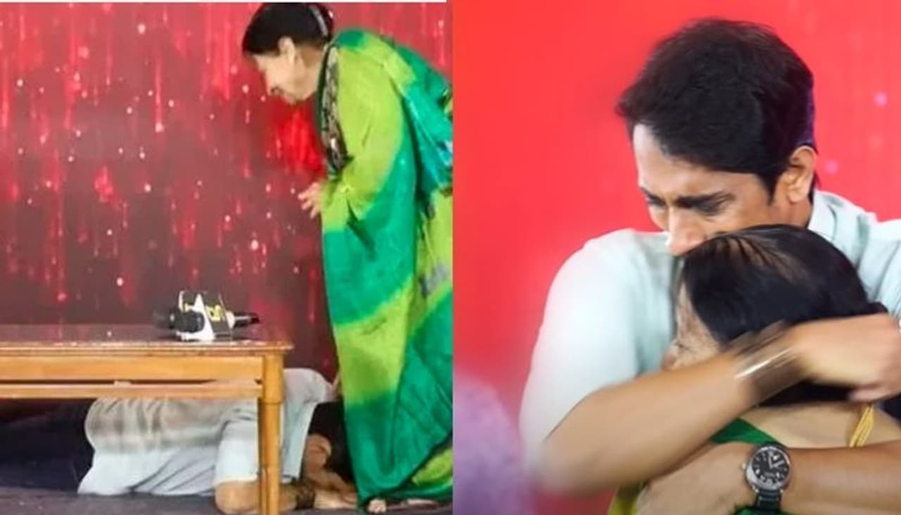 సిద్దార్థ్ రీసెంట్ గా ఓ ఇంటర్వ్యూలో పాల్గొనగా అతడికి ఊహించని సర్ప్రైజ్ ఎదురైంది. అక్కడ యాంకర్స్ వేదికపైకి సిద్దార్థ్ కి తెలియకుండా సుజాత రంగరాజన్ అనే మహిళని తీసుకువచ్చారు. ఒక్కసారిగా సిద్దార్థ్ ఆమెని చూడడంతో నమ్మలేకపోయాడు. వెంటనే సిద్దార్థ్ కన్నీటి పర్యంతం అయ్యాడు. ఆమె కాళ్లపై పడి మొక్కాడు. ప్రేమగా కౌగలించుకుని వెక్కి వెక్కి ఏడ్చాడు.
