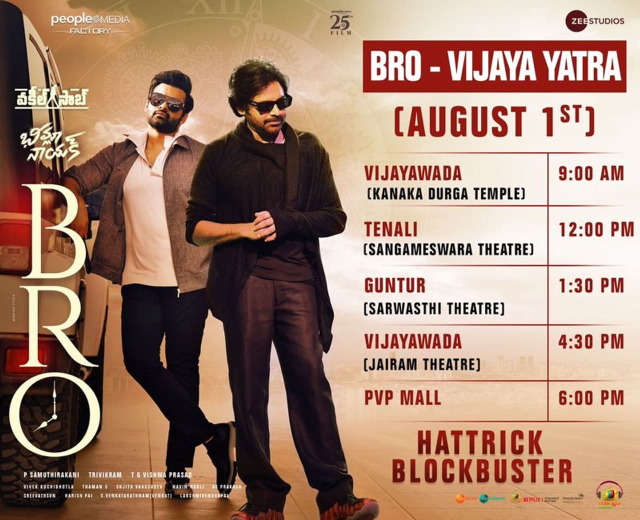 పవన్ కళ్యాణ్ - సాయి ధరమ్ తేజ్ కలిసి నటించిన చిత్రం ‘బ్రో : ది అవతార్’. జూలై 28న ఈ చిత్రం ప్రేక్షకుల ముందుకు వచ్చింది. హిట్ టాక్ ను అందుకుంది. బాక్సాఫీస్ వద్ద కలెక్లన్లను రాబడుతోంది. సినిమా సక్సెస్ టాక్ ను అందుకోవడంతో మేకర్స్ ‘బ్రో - విజయ్ యాత్ర’ను నిర్వహించేందుకు ఏర్పాట్లు చేశారు. ఇప్పటికే సక్సెస్ సెలబ్రేషన్స్ నిర్వహించారు. ఇక ఆగస్టు 1న యాత్ర సాగనుంది. విజయవాడలోని కనకదుర్గ టెంపుల్ లో 9 గంటలకు ప్రారంభమై.. 12 గంటలకు తెనాలిలోని సంగమేశ్వర థియేటర్, 1:30కి గుంటూరులోని సర్వస్తి థియేటర్, 4 :30కి విజయవాడలోని జైరామ్ థియేటర్, 6 గంటలకు పీవీపీ మాల్ ను సందర్శించనున్నారు. అభిమానులు ఈ యాత్రను విజయవంతం చేసేందుకు సిద్ధంగా ఉన్నారు. ఈ సినిమాకు సముద్రఖని దర్శకత్వం వహించారు. ప్రియా వారియర్, కేతికా శర్మ హీరోయిన్లు గా అలరించారు. పీపుల్ మీడియా ఫ్యాక్టరీ నిర్మించింది.