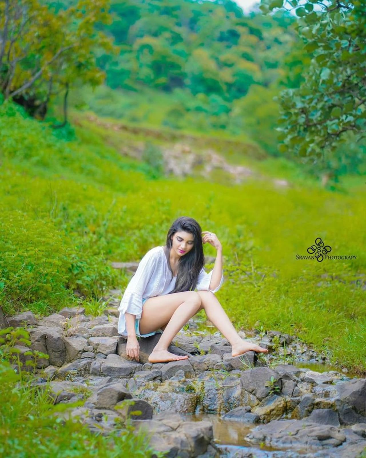 ఫారెస్ట్ ఏరియాలో సన్నగా జలపాతాల్లో నీరు ప్రవహిస్తుండగా, రాళ్లపై కూర్చొని హోయలు పోయింది. ఇందులో తన సెక్సీ తొడలను చూపిస్తూ రెచ్చిపోయింది.