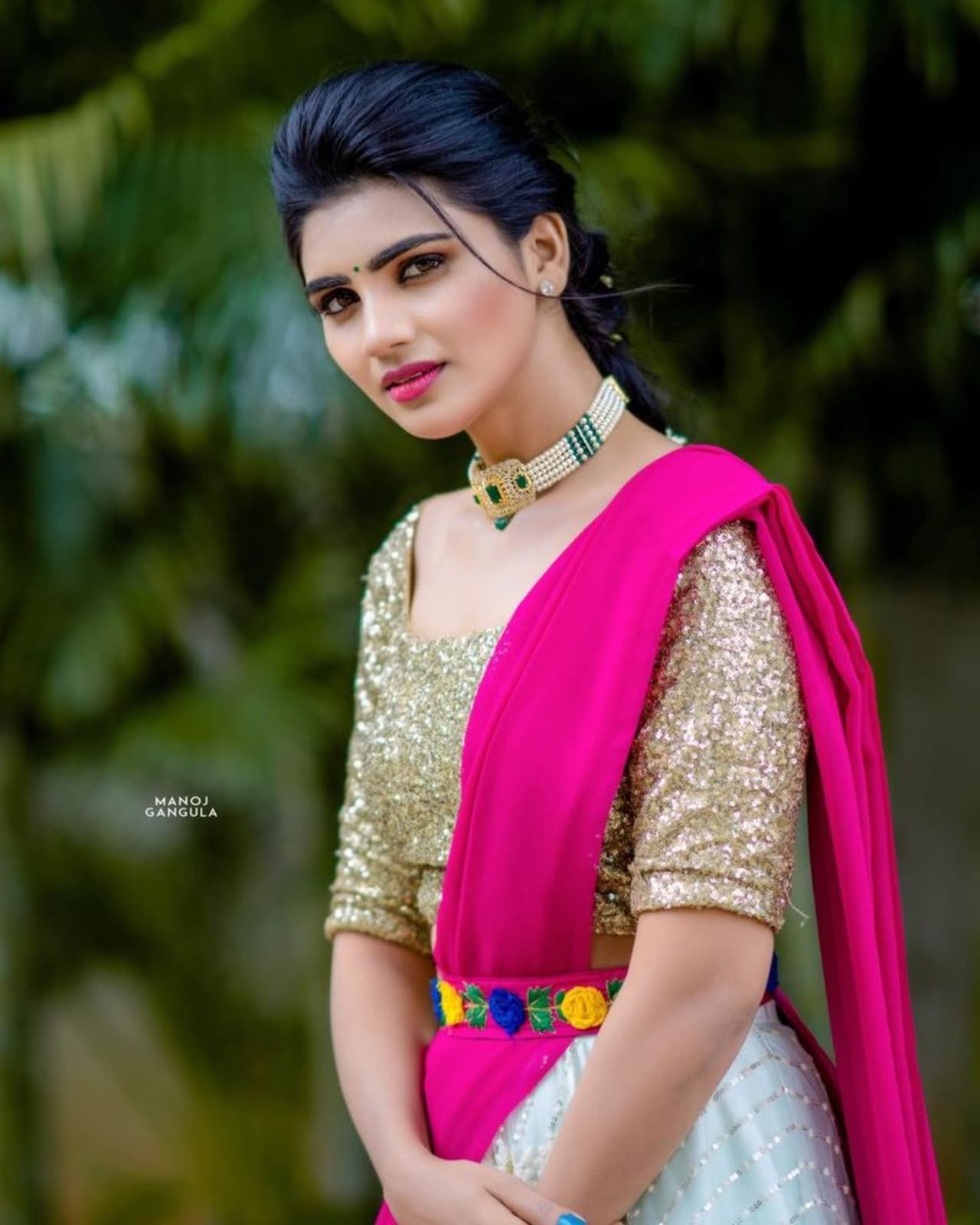 తాజాగా పంచుకున్న హాఫ్ శారీ పిక్స్ కుర్రాళ్ల మతిపోగొడుతున్నాయి. కలర్ ఫుల్ డ్రెస్లో కనువిందు చేస్తుంది వర్ష. కొంచె చూపులు, చిలిపి చూపులతో, కుర్రాళ్లని హంట్ చేస్తుంది.