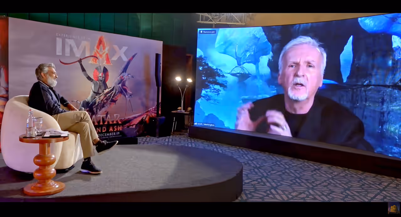 కామెరూన్ మాట్లాడుతూ.. ఫిలిం మేకర్స్ క్రియేటివ్ ప్రాసెస్ గురించి చర్చించుకోవడం చాలా అవసరం. నేను ఏదో ఒక టైంలో నీ సినిమా సెట్ కి రావాలని అనుకుంటున్నాను. నేను నీ మూవీ షూటింగ్ కి రావచ్చా అని కామెరూన్ అడిగారు. వెంటనే రాజమౌళి స్పందిస్తూ అంతకి మించిన గౌరవం ఇంకొకటి లేదు. మీ కోసం నా సినిమా యూనిట్ మాత్రమే కాదు, తెలుగు చిత్ర పరిశ్రమ మొత్తం ఎదురుచూస్తుంది.. మీరు వస్తే ఘనస్వాగతం లభిస్తుంది అని అన్నారు.
