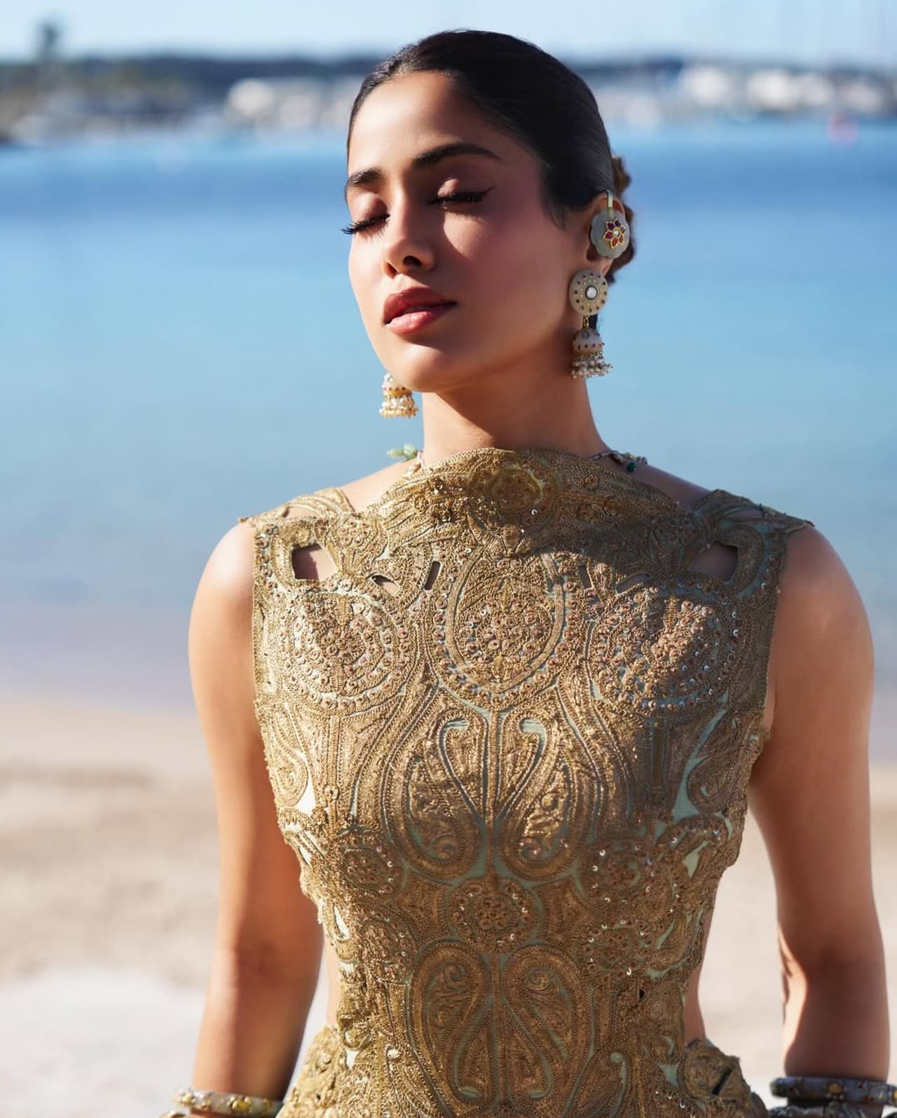 జాన్వీ జుట్టును బన్గా కట్టుకుని, చెవులకు ట్రెడిషనల్ చెవిరింగులు ధరించింది.