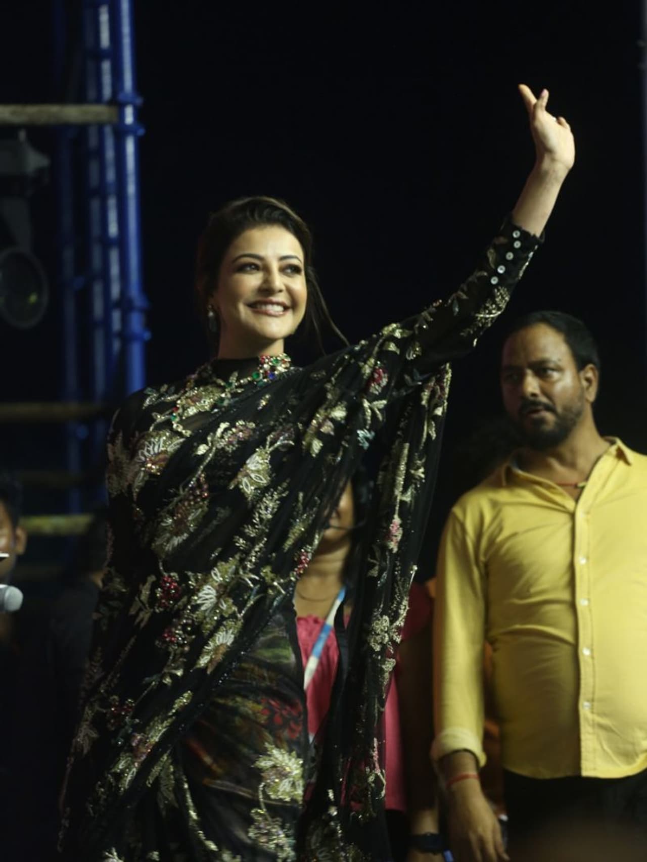 `భగవంత్ కేసరి` ఈవెంట్లో కాజల్ స్పెషల్ ఎట్రాక్షన్గా నిలవడమే కాదు, స్టేజ్ని ఓ ఊపు ఊపేసింది. ఆమె అభివాదం చెబుతూ, స్టయిల్గా ఇచ్చిన పోజులు మైండ్ బ్లాక్ అనేలా ఉండటం విశేషం.