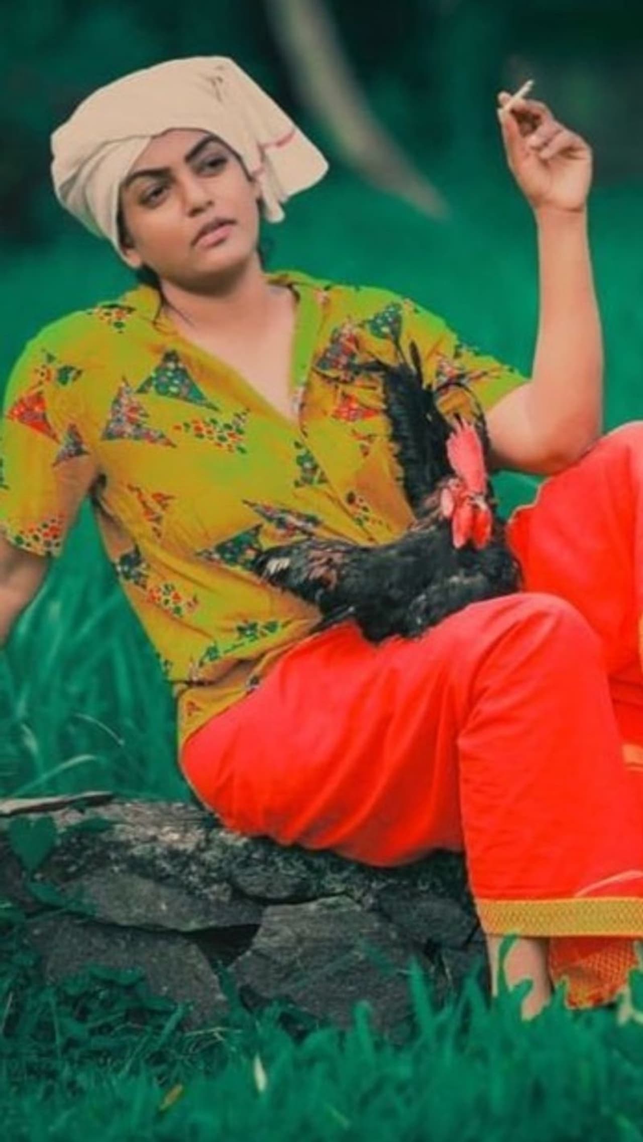 తాజాగా తలపై పాగా, నోట్లో బీడీ, చేతిలో కోడి పుంజు పట్టుకొని పచ్చని పొల్లాలో ఫోటో షూట్ చేసింది. అచ్చు గోదారి జిల్లాల కుర్రోడిలా మాస్ లుక్ లో కనిపించి షాక్ ఇచ్చింది.
