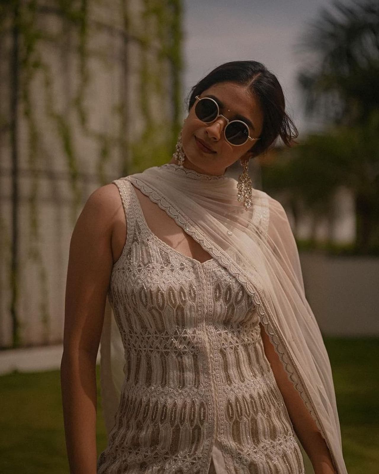 ఇక తాజాగా కీర్తి సురేష్ వైట్ డ్రెస్ లో చేసిన సందడికి కుర్రాళ్ల మతులు పోతున్నాయి. స్లీవ్ లెస్ డ్రెస్ లో.. డిఫరెంట్ మేకప్ లోమెరిసిపోయింది మలయాళ భామ. కళ్లజోడుతో కిర్రాక్ ఫోజులిస్తూ.. కనిపించింది.