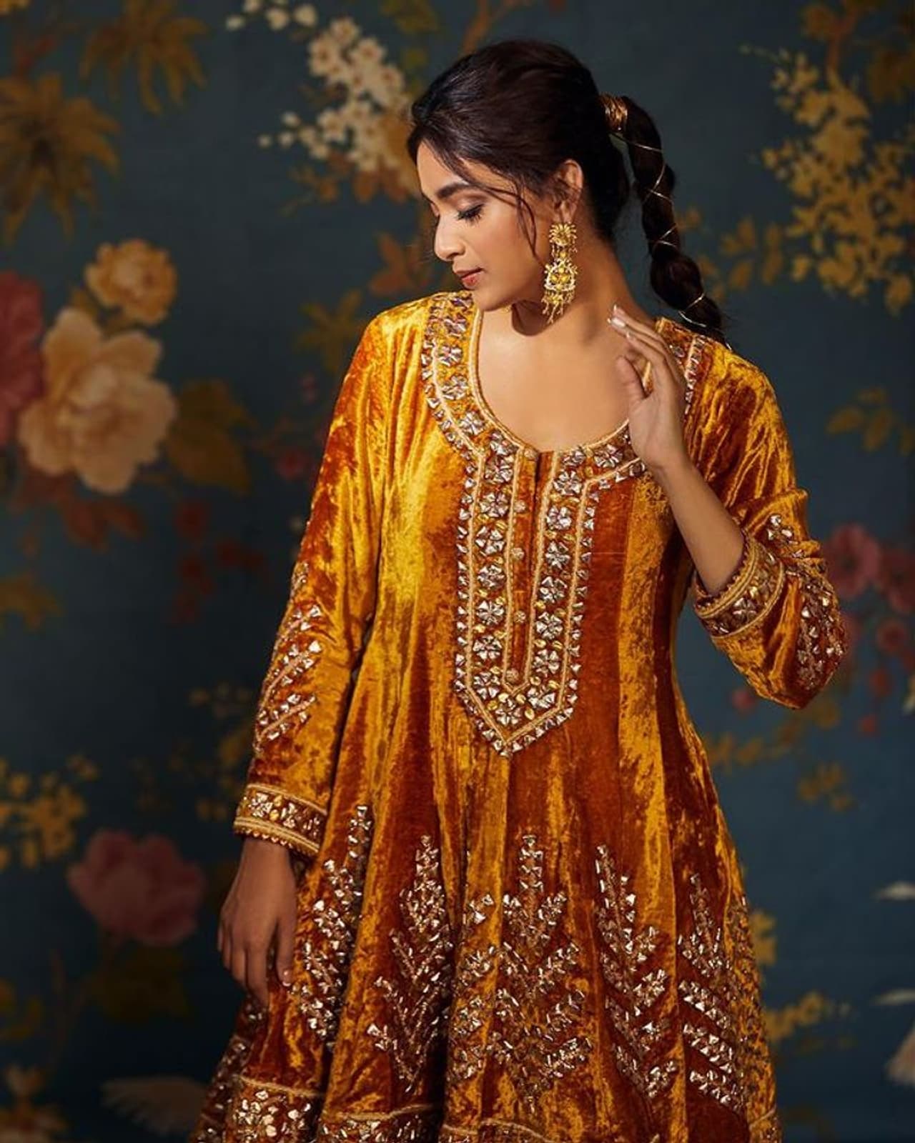 పసుపు రంగు సల్వార్ సూట్లో, కీర్తి సురేష్ అద్భుతంగా కనిపిస్తుంది. వెల్వెట్ కుర్తాతో ఫుల్ స్లీవ్లో మతిపోగొడుతోంది. అట్రాక్టివ్ జూవెల్లరీ, పోనీ టెయిల్ తో పిచ్చెక్కిస్తోంది. చాలా ప్రశాంతమైన లుక్ లో కనిపిస్తోంది కీర్తి సురేష్. మొత్తంగా తన అలంకరణతో నెటిజన్లను ఖుషీ చేస్తోంది.