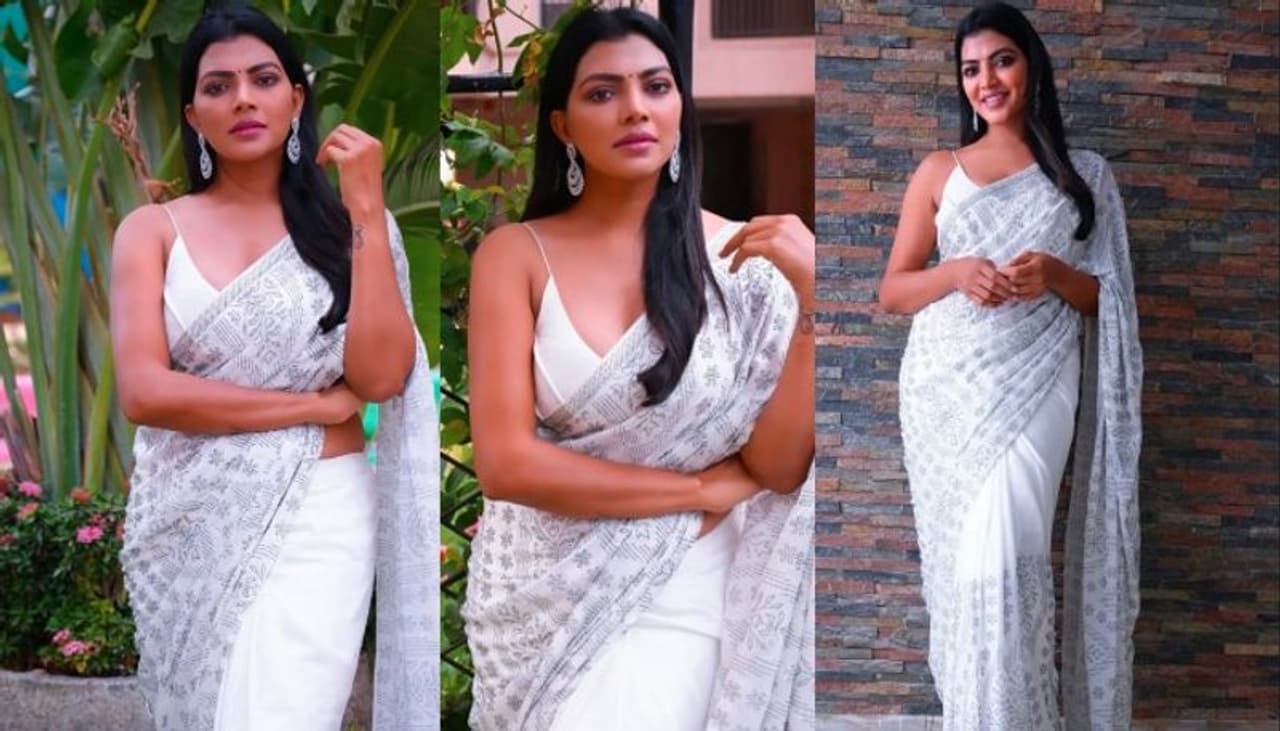 లహరి ఎంతో అందంగా నిలువెత్తు సొగసుతో మెస్మరైజ్ చేస్తూ చీరలో తెల్ల పావురం లా మెరిసిపోతోంది. అయితే ఆమె స్లీవ్ లెస్ బ్లౌజ్ లో దాగున్న అందాలు కుర్రాళ్ళని ఒరిస్తున్నాయి.