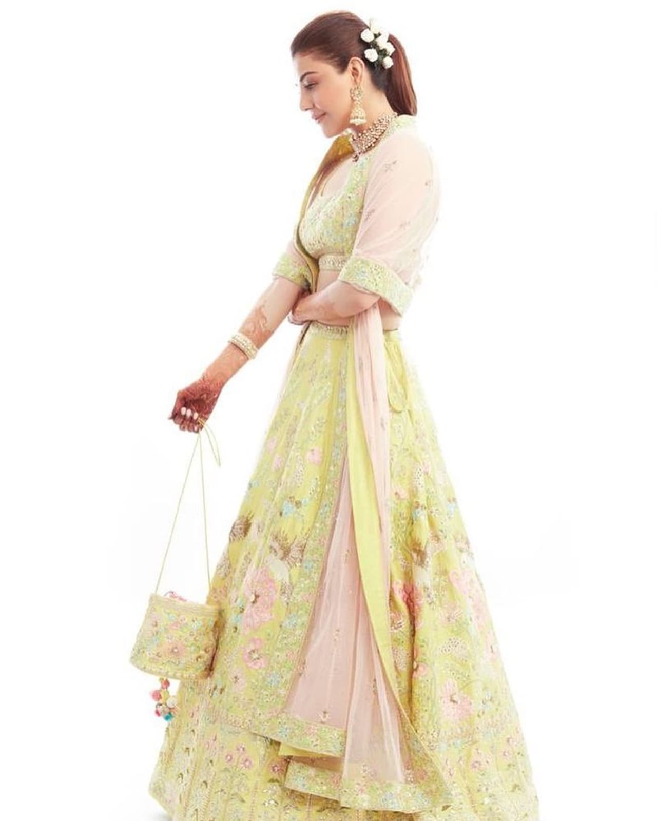 <p>తాజాగా కాజల్ సాంప్రదాయ లెహంగాలో కనువిందు చేశారు. లైట్ పింక్, పసుపు పచ్చ వన్నె కలిగిన డిజైనర్ లెహంగా కాజల్ ధరించడం జరిగింది. పూలతో డిజైన్ చేసిన జ్యుయలరీ మరో ఆకర్షణ. ప్రముఖ డిజైనర్ అనితా డోంగ్రే ఈ డ్రెస్ డిజైన్ చేయగా కాజల్ ఆమెకు అభినందనలు తెలిపారు.</p>