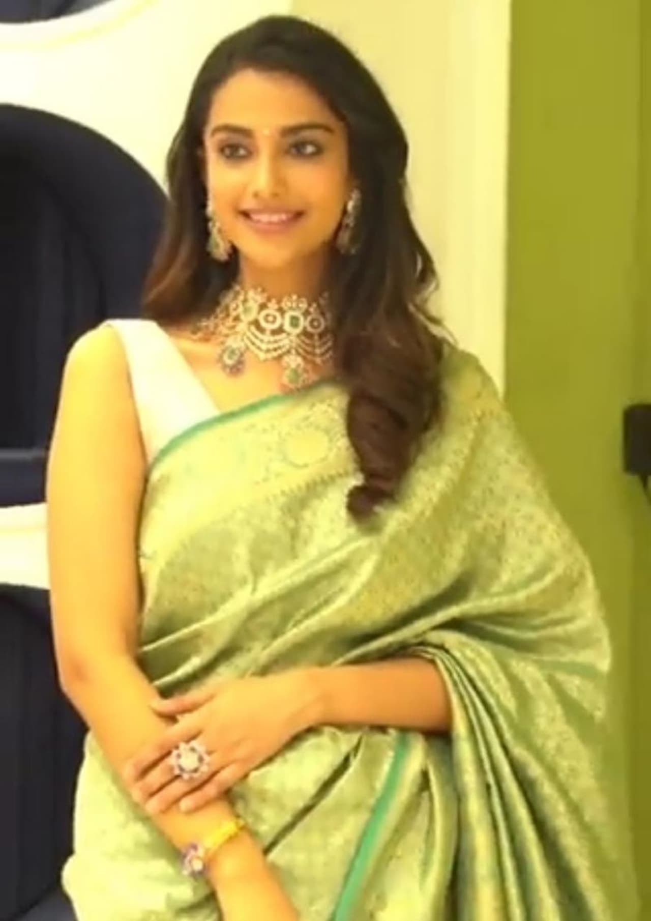 స్టోర్ ప్రారంభోత్సవానికి మీనాక్షి చౌదరి చిలుక పచ్చ రంగు చీరలో మెరిసింది. పట్టుశారీలో మెరిసిపోయింది. ఎప్పుడూ ట్రెండీ అవుట్ ఫిట్లలో మెరిసే ఈ ముద్దుగుమ్మ సంప్రదాయ దుస్తుల్లో వెలిగిపోతోంది. తన బ్యూటీఫుల్ లుక్ తో ఆడియెన్స్ ను ఫిదా చేసింది.
